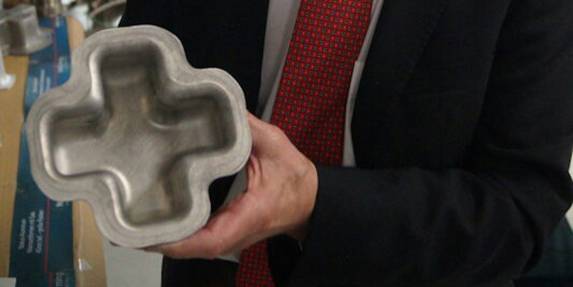 Unscheinbare „Backform“: HoDforming-Geschäftsführer Peter Amberg zeigt ein Bauteil, das mit dem HDF-Verfahren hergestellt wurde.