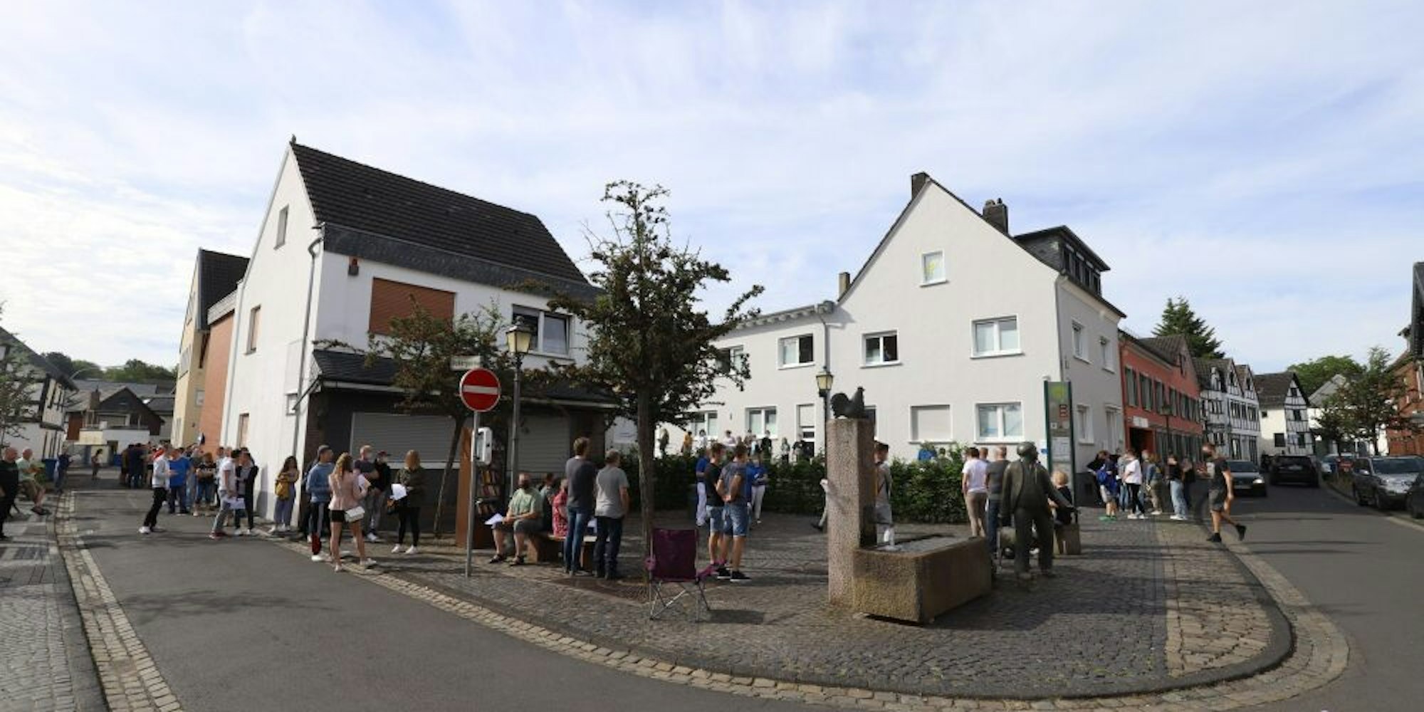 Mechernich-Kommern – Es war nicht schwer zu erkennen, dass an diesem Morgen in Kommern etwas Besonderes stattfand. In langer Reihe standen die Menschen am Samstag von der Kölner Straße in die Pützgasse bis über den Bleibach. Manche hatten sich mit Campingstühlen ausgerüstet, weil sie lange Wartezeiten befürchteten. Doch das Interesse galt nicht begehrten Konzerttickets oder Sonderangeboten. An diesem Tag konnten die Menschen ohne Termin und Voranmeldung eine Corona-Schutzimpfung erhalten