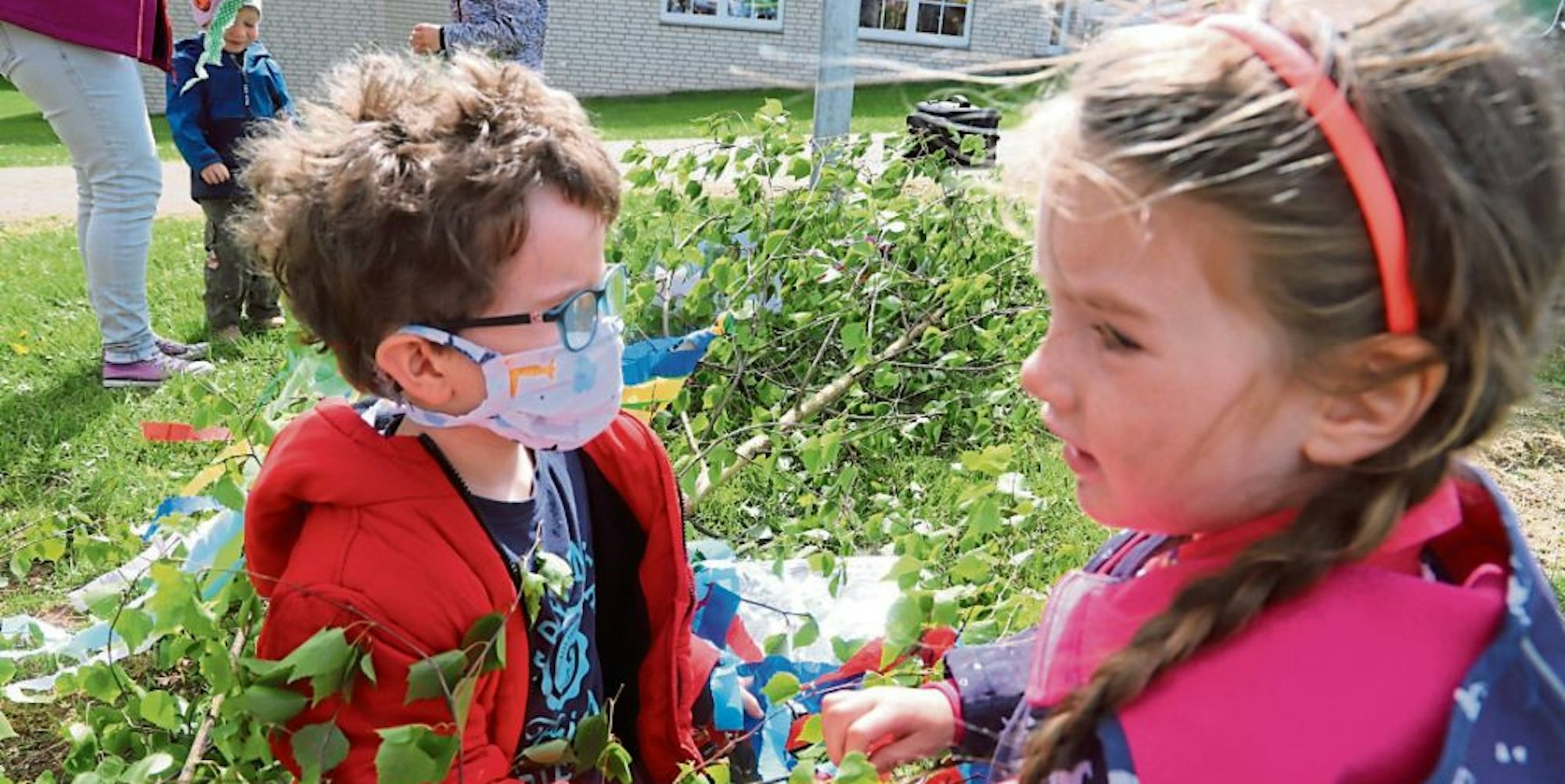 Maibaum als MutmacherKinder schmückten Birke mit Kreppbändern und bunten Schildern