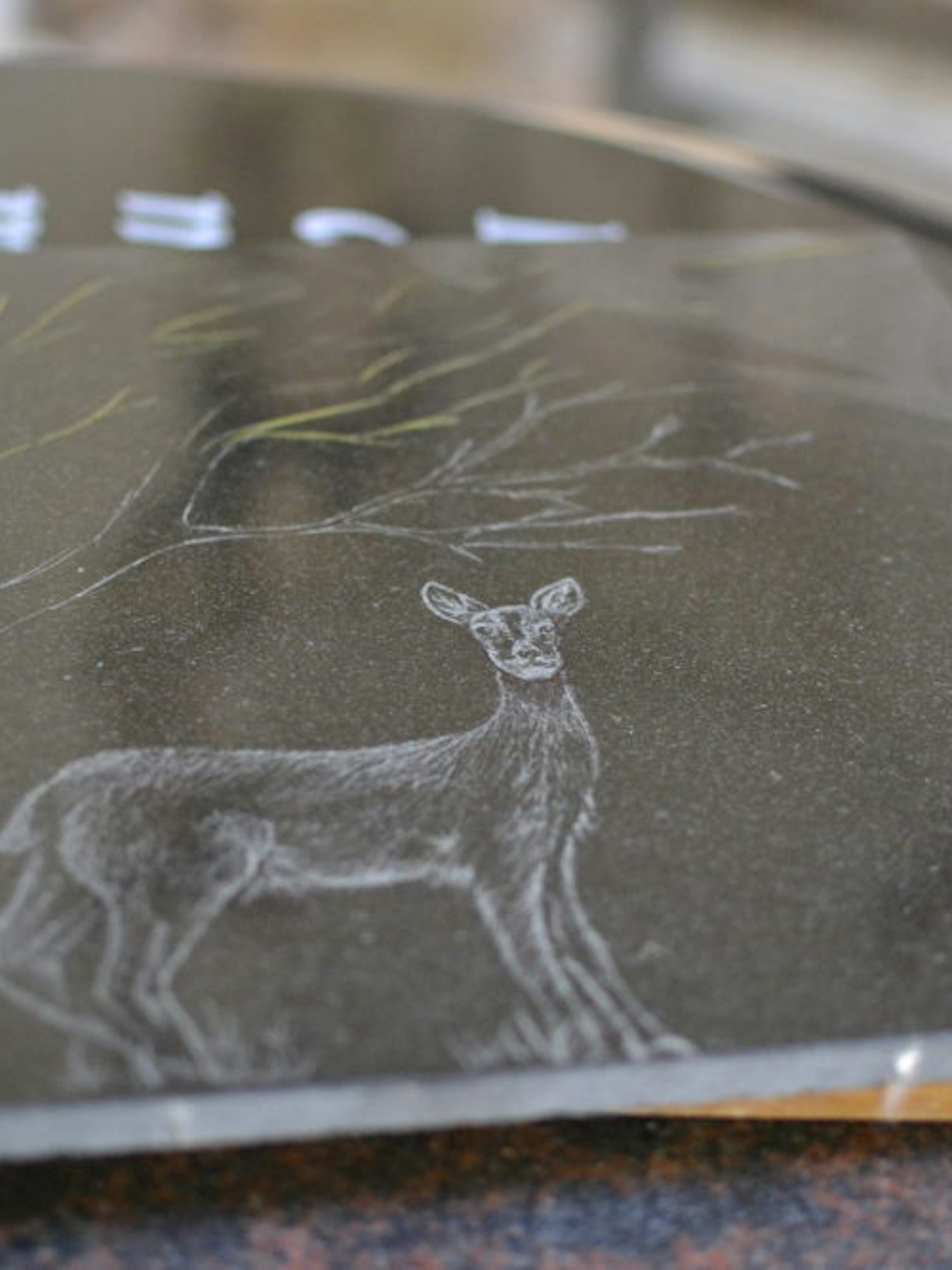 Der Grabstein kann nun zum Sandsteinstrahler. Simons befestigt ihn mit Hilfe eines anderen Gesellen. Im Betrieb ist sie als Bildhauerin auch für die künstlerischen Elemente zuständig. Rehe, Blätterranken, Blumen und Sonnen hat sie schon in Grabsteine gehauen. Auf einem Foto zeigt sie ihre bisher einprägsamste Arbeit: Der Stein für ein Kindergrab. In die obere Ecke hat Simons ein Baby auf einer Treppe gemeißelt. Am Ende der Treppe hat sie ein Loch in den Stein geschlagen und eine Glasscheibe eingesetzt. Es sieht so aus, als krabbele das Baby ins Licht. „Das war ein schöner Entwurf, weil er eine Bedeutung hatte“, so Simons.