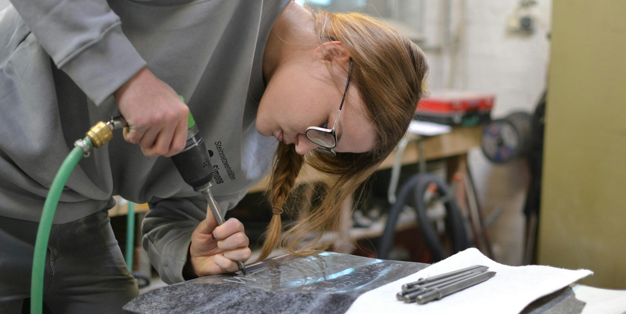 Konzentriert und präzise meißelt Steinmetzin Beate Simons die Kanten in die Buchstaben auf dem Grabstein. Für ihre Ausbildung zu Steinmetzin hat sie ihr BWL-Studium abgebrochen.