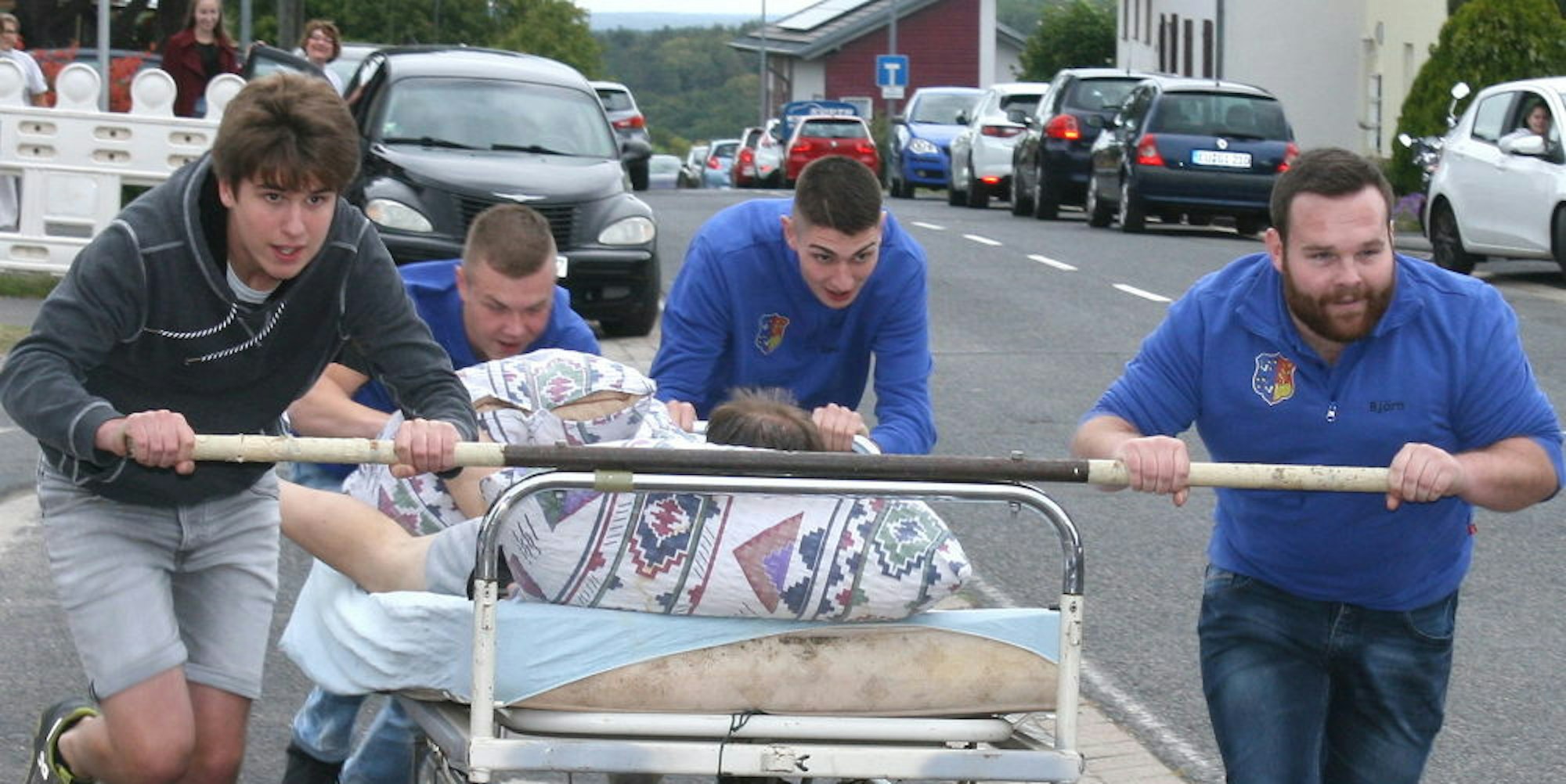 Bei diesem vom Holzheimer Gastronom Volker Prause nach Vorbildern aus seiner Heimat im Landkreis Cloppenburg importierten Idee des Wett-Schiebens geht es nicht nur um Schnelligkeit. Drei bis vier schieben einen oder eine auf einem ausrangierten Krankenhausbett. Einmal geht’s die Strecke rauf. Rund um einen Pflanzenkübel ist das Wendemanöver gekonnt zu vollziehen und schließlich geht’s die Strecke wieder herunter. „Bis zur HSV-Fahne vor unserem Haus“, so Volker Prause.