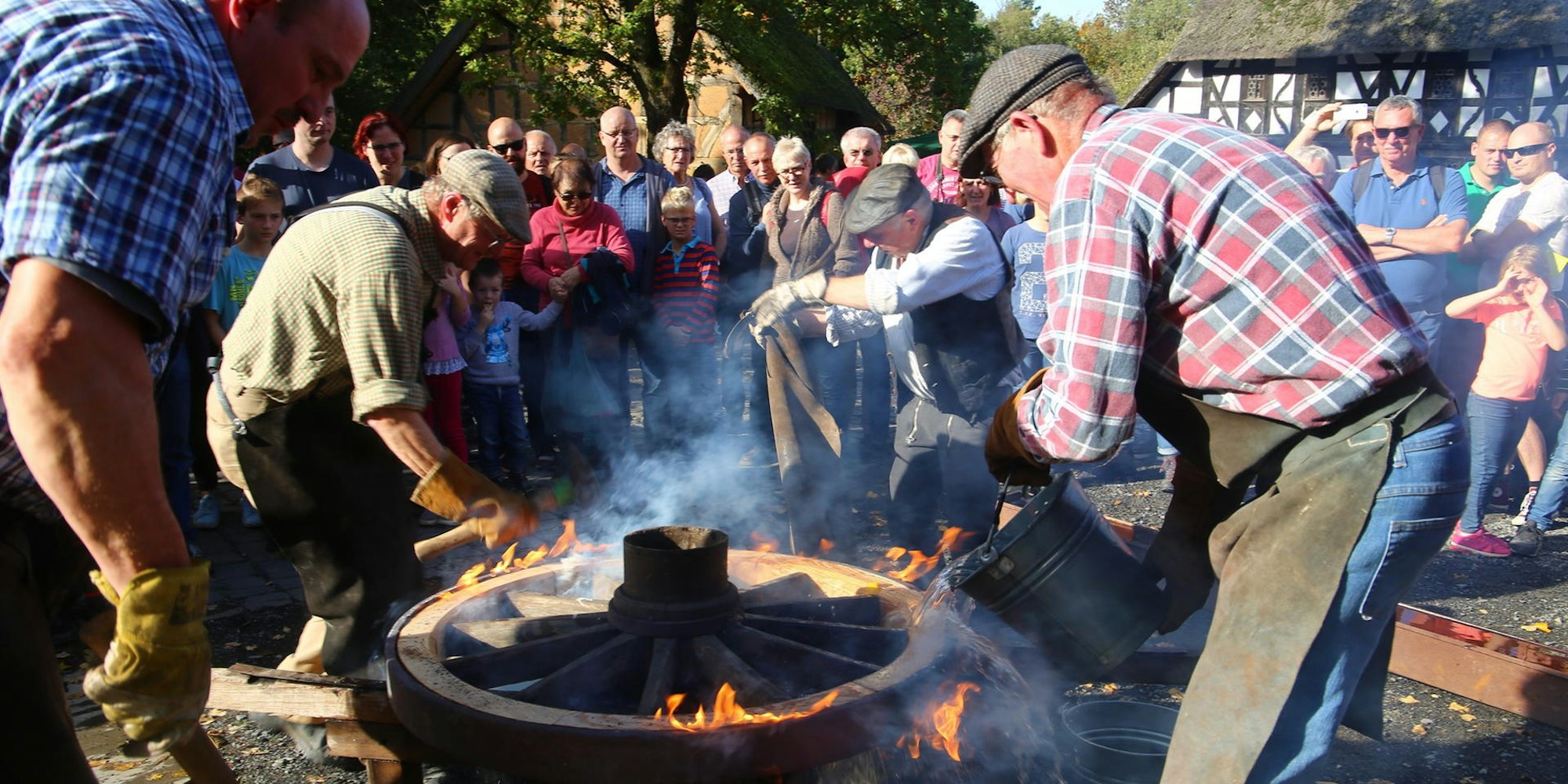 „Heiße Reifen“ heißt dieser Vorgang im Programmangebot des Museums. Der Metallreifen wird bis zum Glühen erhitzt und dann auf das hölzerne Speichenrad geschoben. Die Hitze des glühenden Metalls setzt das Eichenholz des Rades in Brand. Mit vielen Eimern Wasser muss das Feuer gelöscht und das Eisen abgekühlt werden.