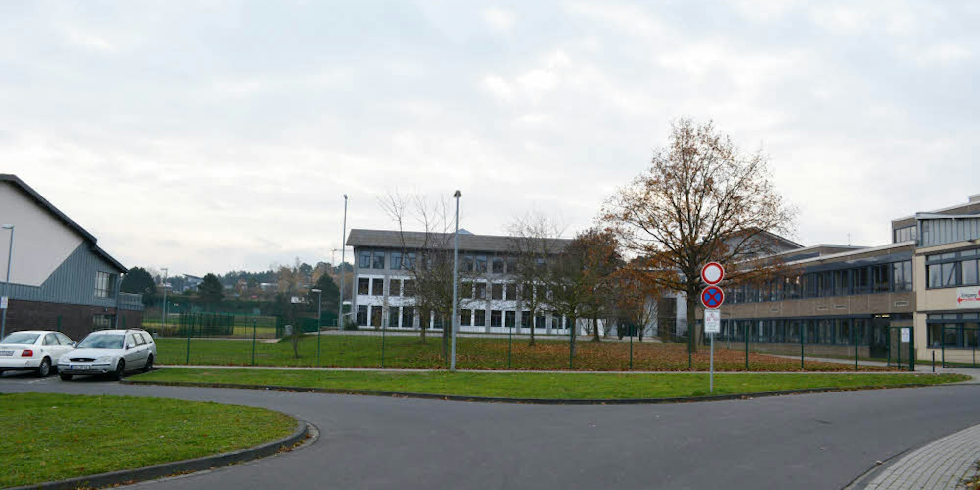 Zwischen Dreifachturnhalle (links) und ehemaligem Hauptschulgebäude wird der neue Anbau für die Gesamtschule entstehen.