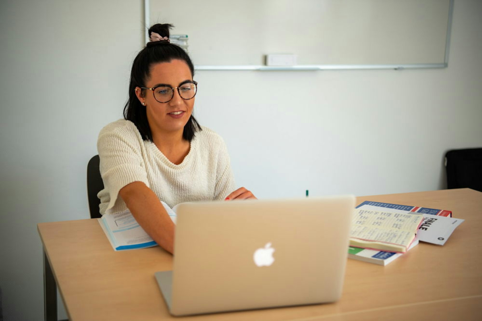 Erklärt die Aufgaben am Laptop: Jana Lux hilft in Englisch.