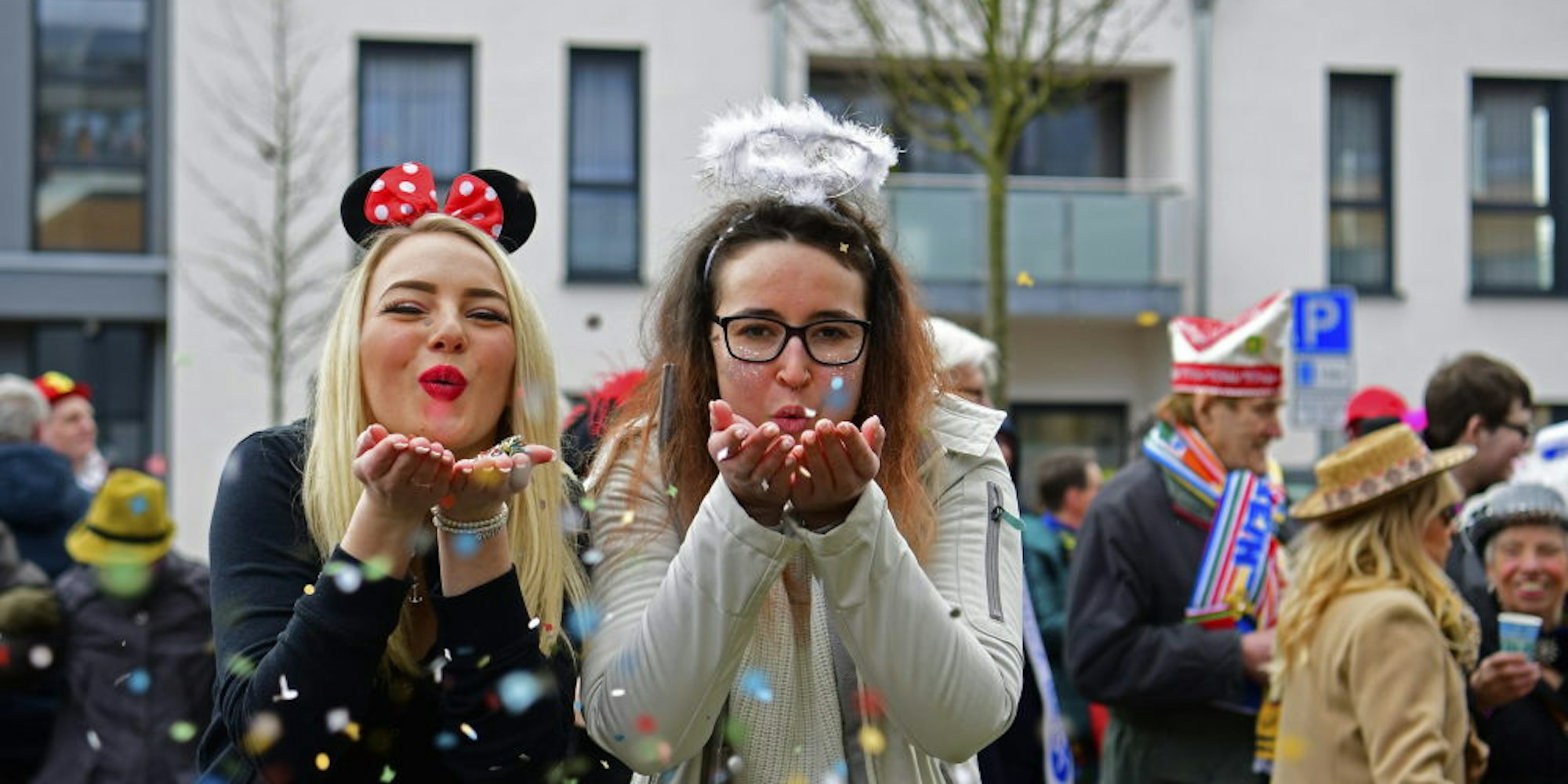 „Karneval ist das Beste“, findet die gebürtige Sächsin Josephine Mondry (l.), die mit Freundin Irina Lübeck vor dem Rathaus feierte.