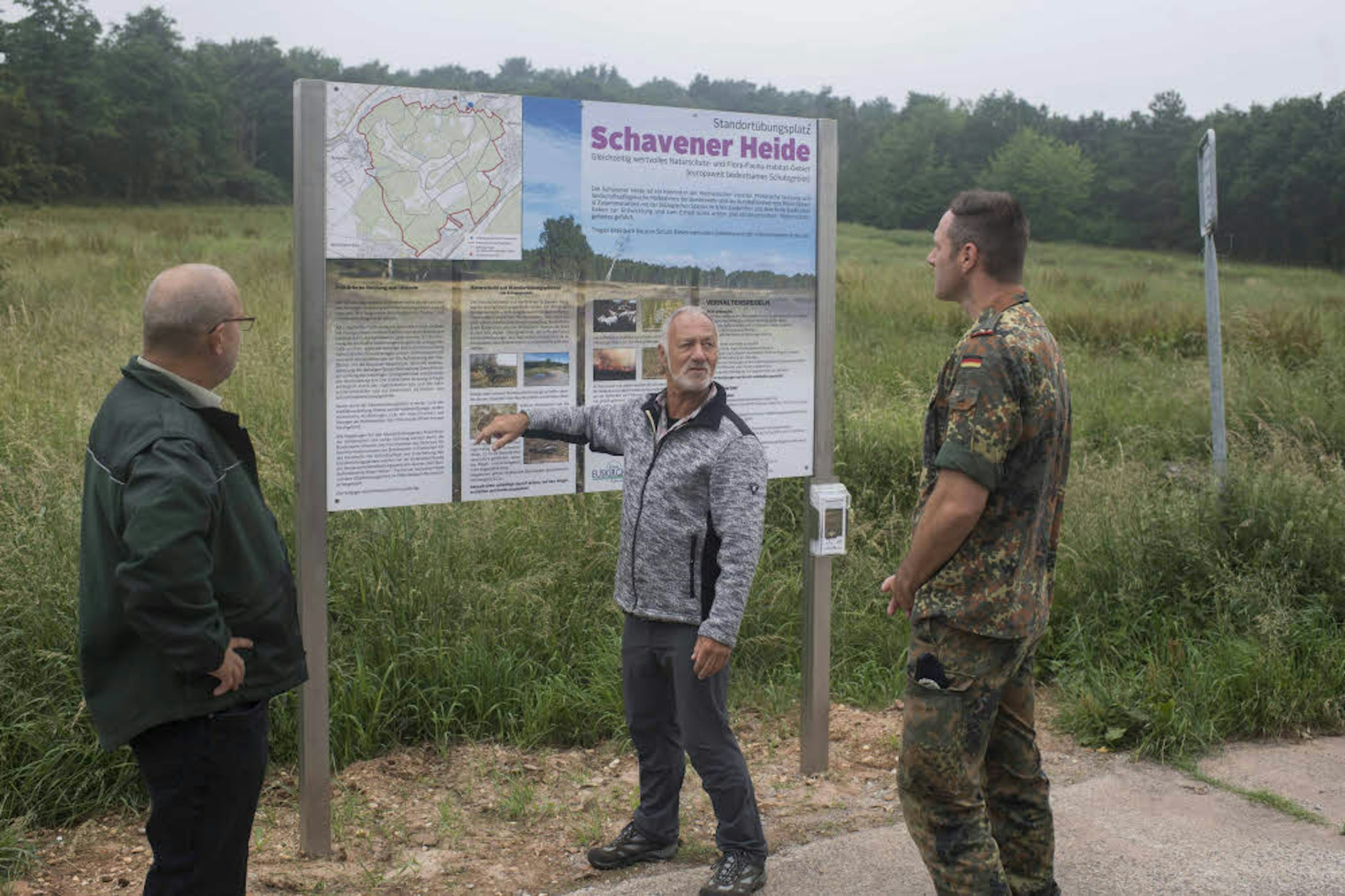 An einem Hauptzugang zur Schavener Heide erklärt Friedrich Bauer (M.) vom Bundeswehrdienstleistungszentrum die neuen Info-Tafeln.