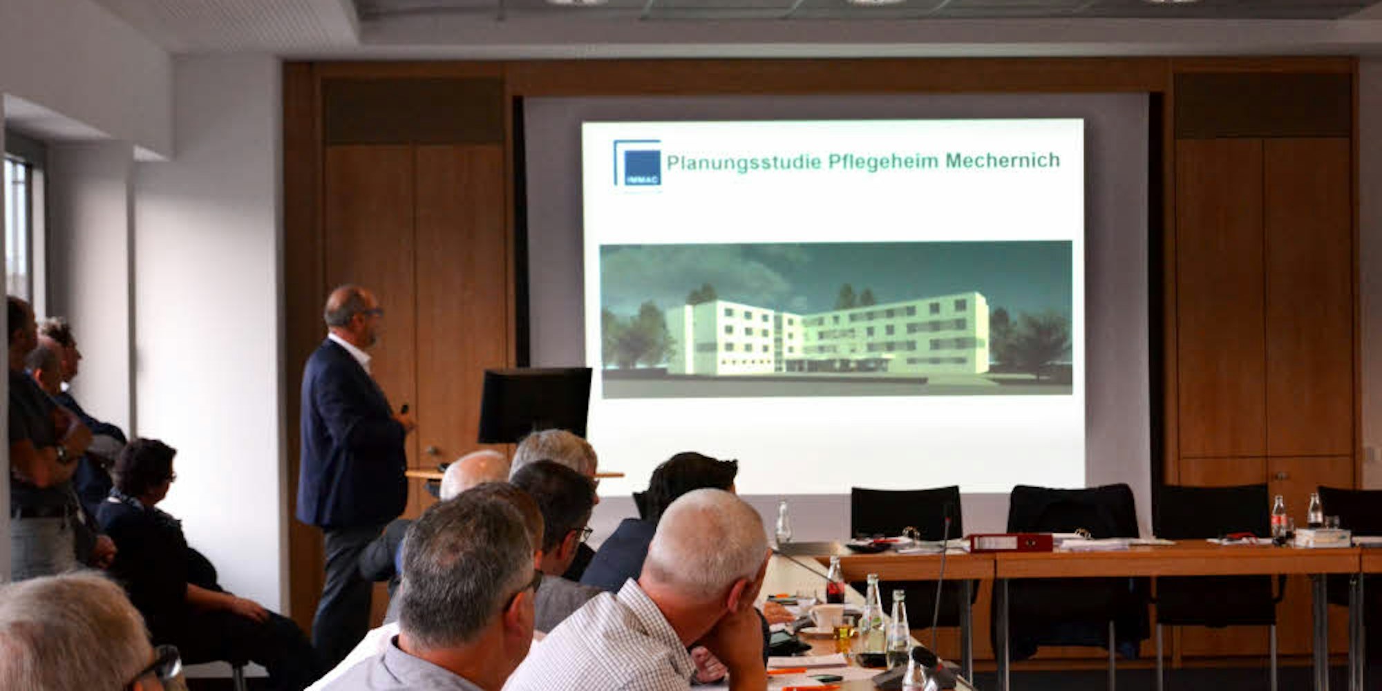 Hans-Dieter Vosen erläuterte die Details des Projektes: Das Gebäude der derzeitigen Pflegeeinrichtung, die einen guten Ruf habe, sei mehr als 50 Jahre alt: „Der Standard entspricht nicht mehr den heutigen Anforderungen und bald auch nicht mehr der Gesetzgebung“, sagte er. Derzeit habe man 52 Bewohner, von denen 32 in Einzelzimmern wohnen, die anderen in zehn Doppelzimmern. 75 Mitarbeiter werden dort beschäftigt. Leider könne man derzeit keine ergänzenden Angebote wie Tagespflege oder senioren- und behindertengerechtes Wohnen anbieten. Doch dafür gebe es inzwischen eine sehr hohe Nachfrage. „Wir möchten einen Ersatzneubau auf dem gleichen Grundstück für 80 Pflegeplätze mit Einzelzimmern erstellen“, kündigte er an. Bereits 2012 sei im Mechernicher Rat eine Erweiterung auf 80 Plätze beschlossen worden. Vosen deutete außerdem an, dass man die Zahl der Arbeitsplätze erhöhen werde.