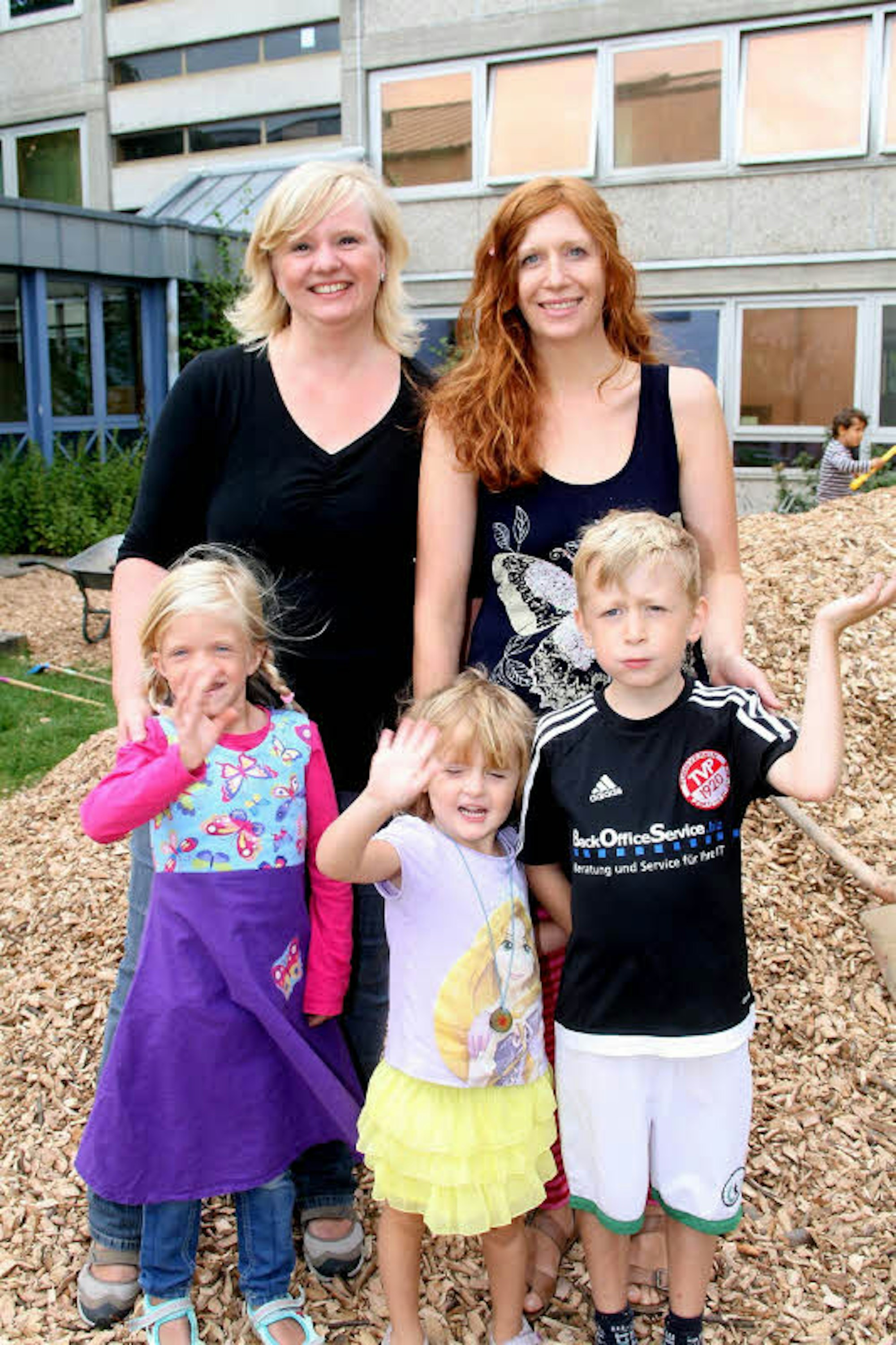 Freuen sich auf ihre neue Schule: Svenja Spittmann (v.l.) mit Tochter Daria, Sandra Düren mit Tochter Jana und Sohn Darion.