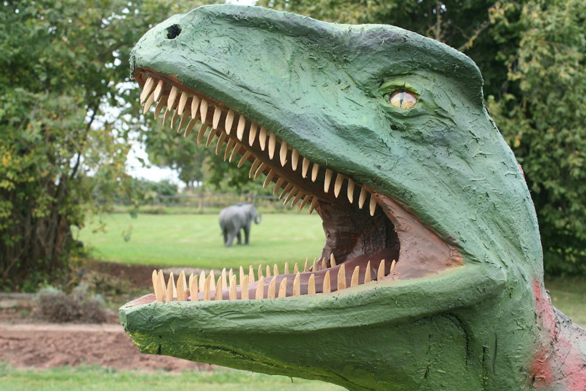 Dinosaurier und Elefant gehören zur Staffage im Garten.