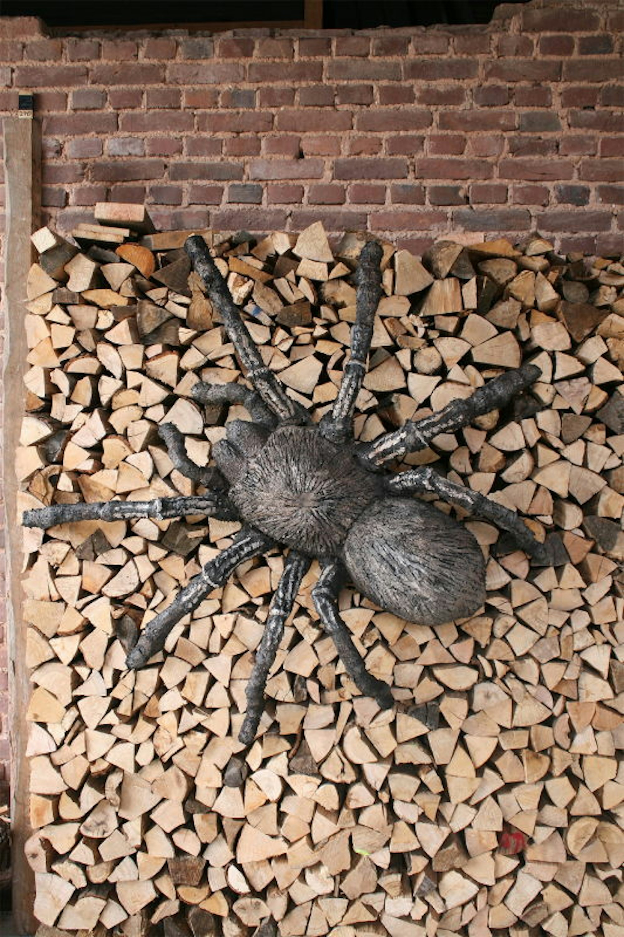 Diese 1,50 Meter große Tarantel „klebt“ am Brennholzstapel.