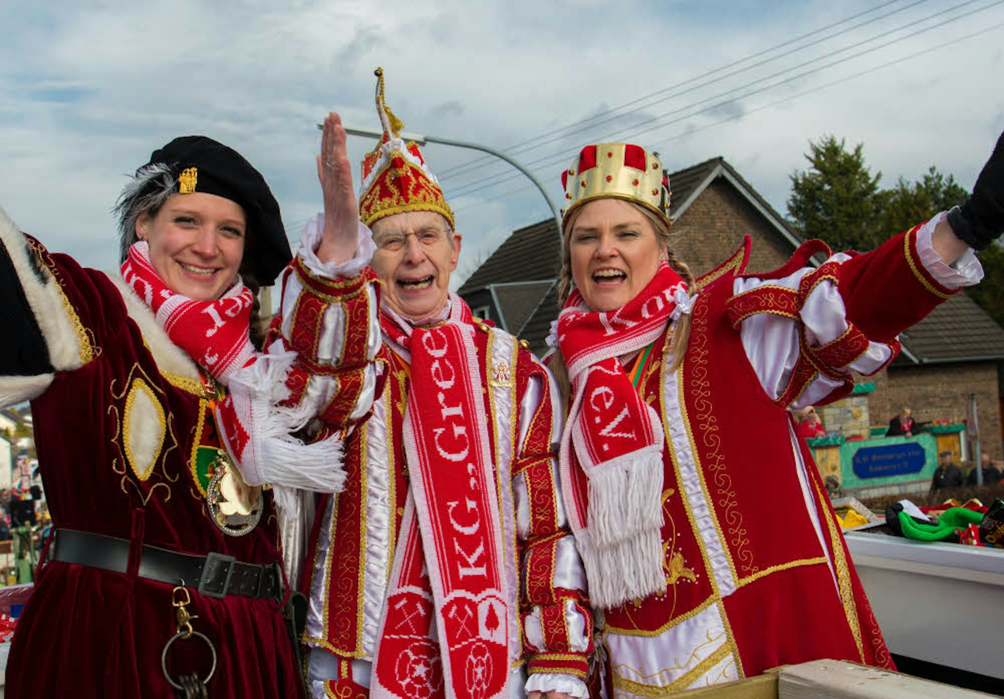 Die hatten sich wie die Teilnehmer mit den wenig einladenden Wetterverhältnissen arrangiert. Durchsichtige Plastik-Ponchos sowie -Planen zierten so manches Kostüm und manchen Wagen – das änderte an dem bunten Bild und an der ausgezeichneten Stimmung jedoch nichts. Ausgezeichnete Stimmung, die ebenfalls hoch oben auf dem Festwagen des Kommerner Damen-Dreigestirns herrschte, wie Prinz Mary I. (Bürger) sichtlich erleichtert sagte: „Nicht die Aufregung war unsere größte Sorge, sondern der Sturm. Schließlich ist das heute der Höhepunkt unserer tollen Session.“