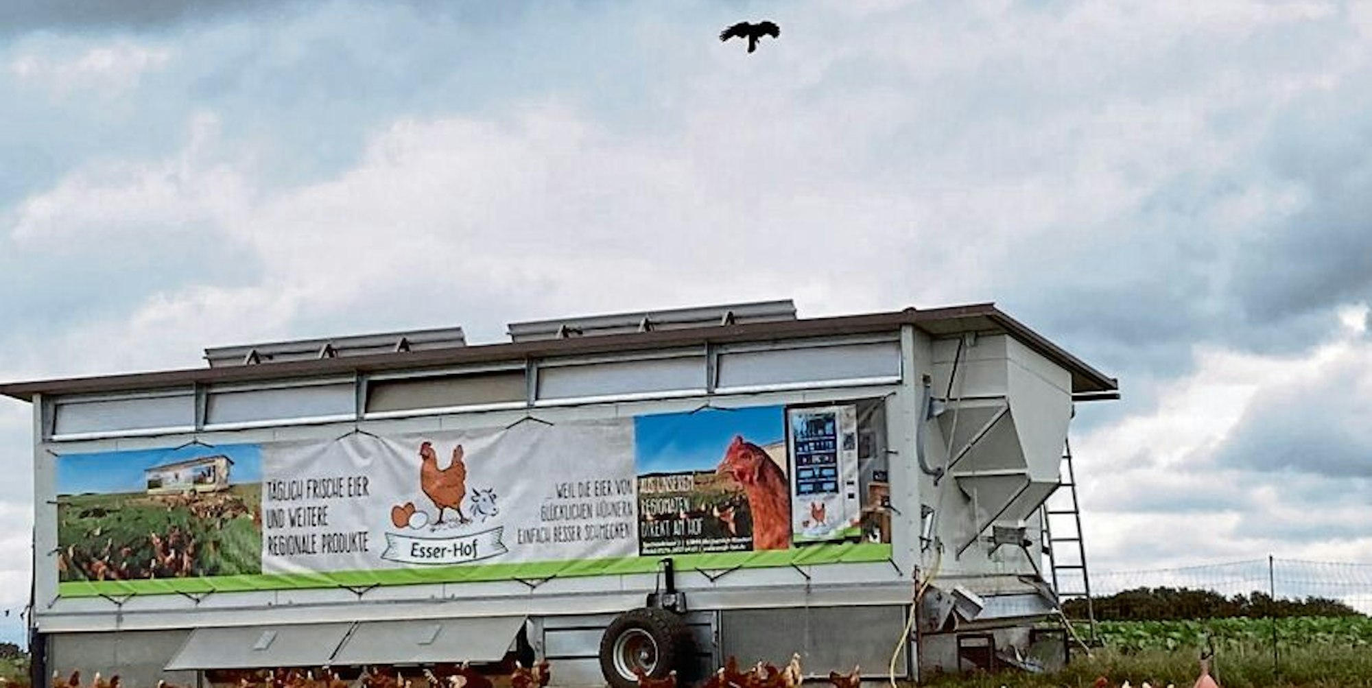 „Sobald ein Greifvogel hier in der Nähe rumfliegt, sieht man, wie die zwei sie verjagen“, berichtet Esser. Er betreibt den Esserhof bereits in der dritten Generation. Vor einem guten halben Jahr beschloss er wegen der hohen Nachfrage nach Eiern, ein Hühnermobil anzuschaffen und die Zahl der Hennen deutlich zu erhöhen. Seitdem leben die Hühner nicht mehr direkt im Hof, sondern auf den Wiesen drum herum.