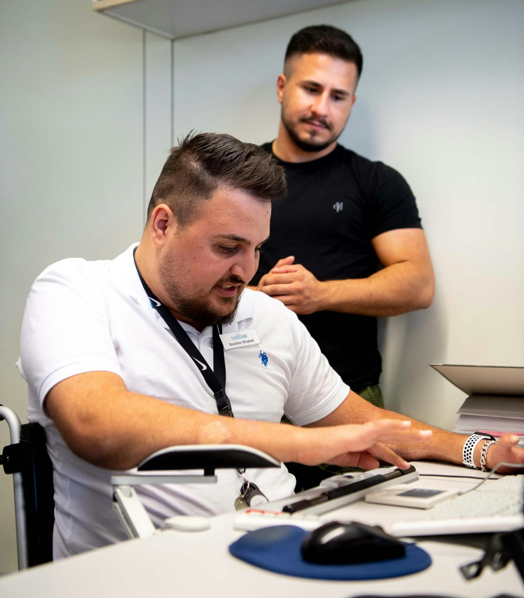In der Verwaltung sitzt Khaled an einem speziellen Arbeitsplatz. Das Mauspad lässt sich individuell programmieren, er hat eine Armstütze, die das Arbeiten erleichtert, den PC kann der 28-Jährige über Sprache steuern. Das alles funktioniert ganz gut, auch wenn es für die Kollegen im Büro komisch klingen muss, wenn Khaled „Aufwachen“ sagt – damit aber nicht sie meint, sondern den PC aus dem Stromsparmodus holt.