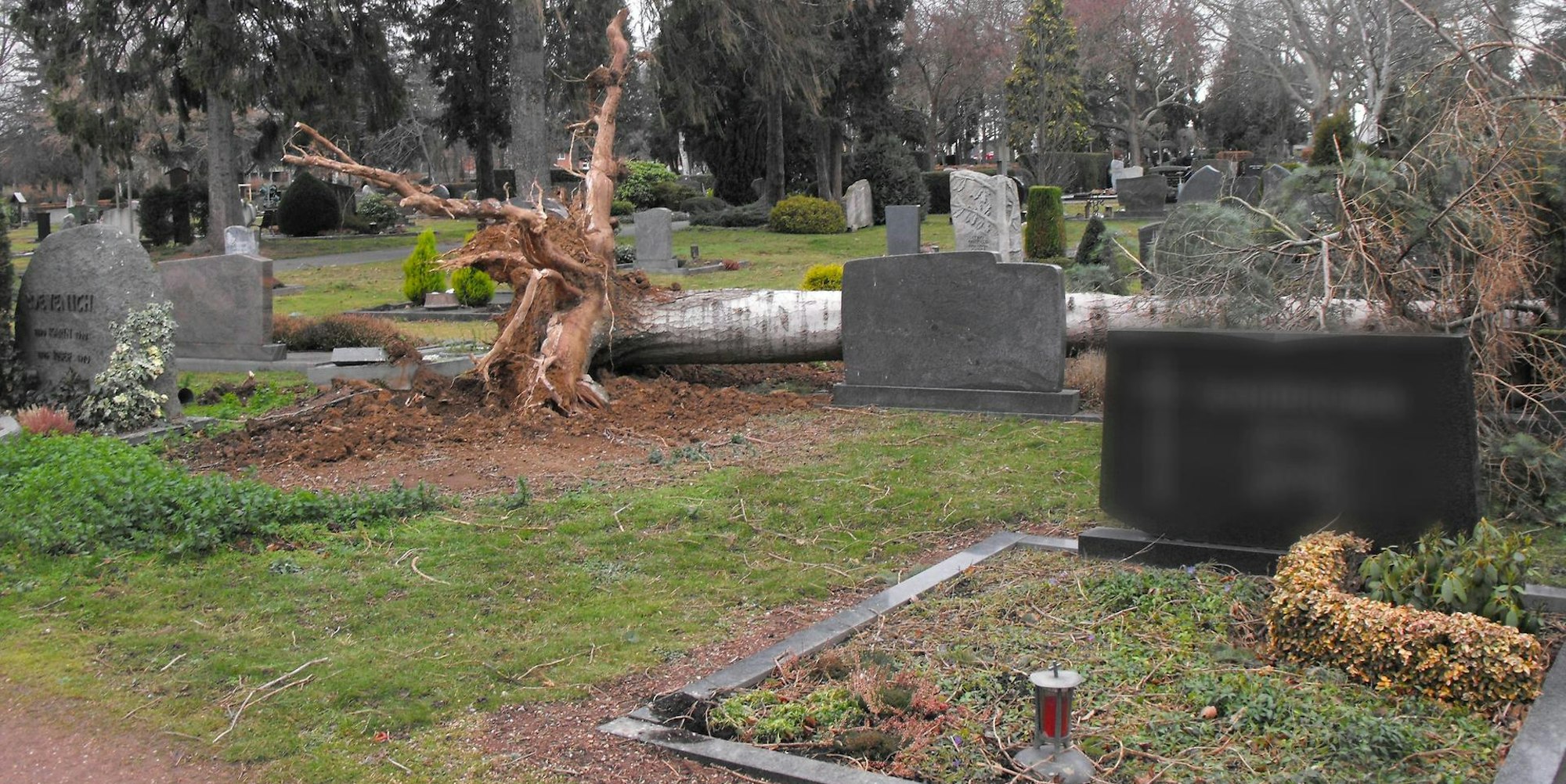 Die Sturmtiefs „Sabine“ und „Victoria“ haben viele Bäume umstürzen lassen, hier auf dem Euskirchener Friedhof.