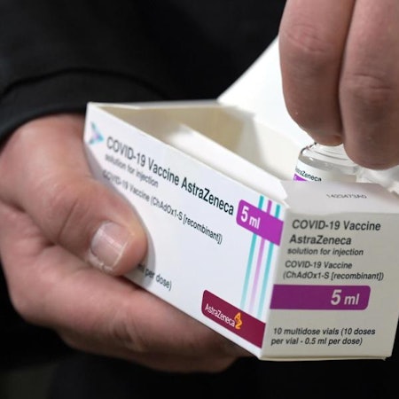 Ein Mitarbeiter in einem Impfzentrum hält ein Fläschchen mit dem Astrazeneca-Wirkstoff gegen Corona in seiner Hand. (Symbolbild)