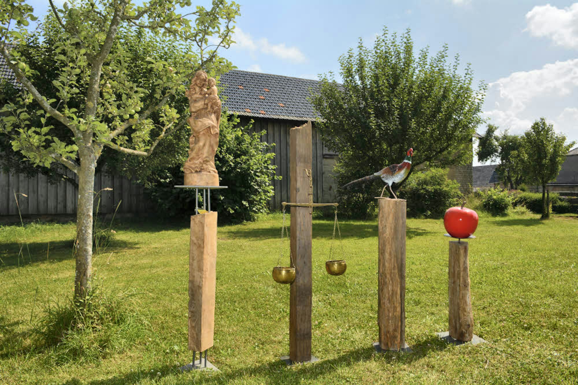 „Unser Sohn Stefan hat ein ganz modernes Haus. Er hat dort nur eine einzige Stele aufgestellt“, berichtet Wilhelmine Dederichs. So könne die Stele die beste Wirkung erzielen. Derzeit hat Dederichs rund 130 Stelen fertiggestellt. Die dafür benötigten Stahlplatten stellt er aus Abfällen der Schlosserei Pesch in Blankenheim-Wald her. Wenn er zu Märkten fahre, um seine Stelen auszustellen, sei das richtig viel Arbeit, denn die Holzobjekte haben ein ziemliches Gewicht.