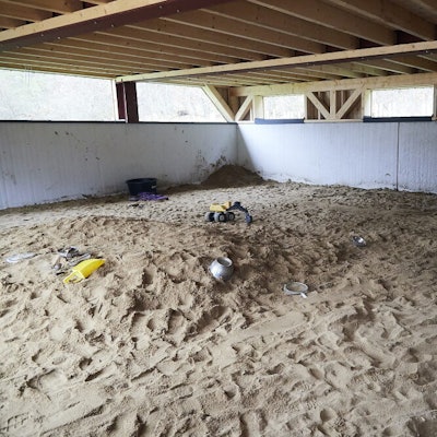 Auf dem Lehmputz in dem alten Wohnhaus ist Schimmel zu erkennen. Das zeigt deutlich, wie viel Feuchtigkeit noch in den Wänden ist. Die Räume sind leer, die Wände bis zur Feuchtigkeitsgrenze von Putz oder Deckschicht befreit. Von Bauarbeiten ist hier noch keine Spur zu sehen.