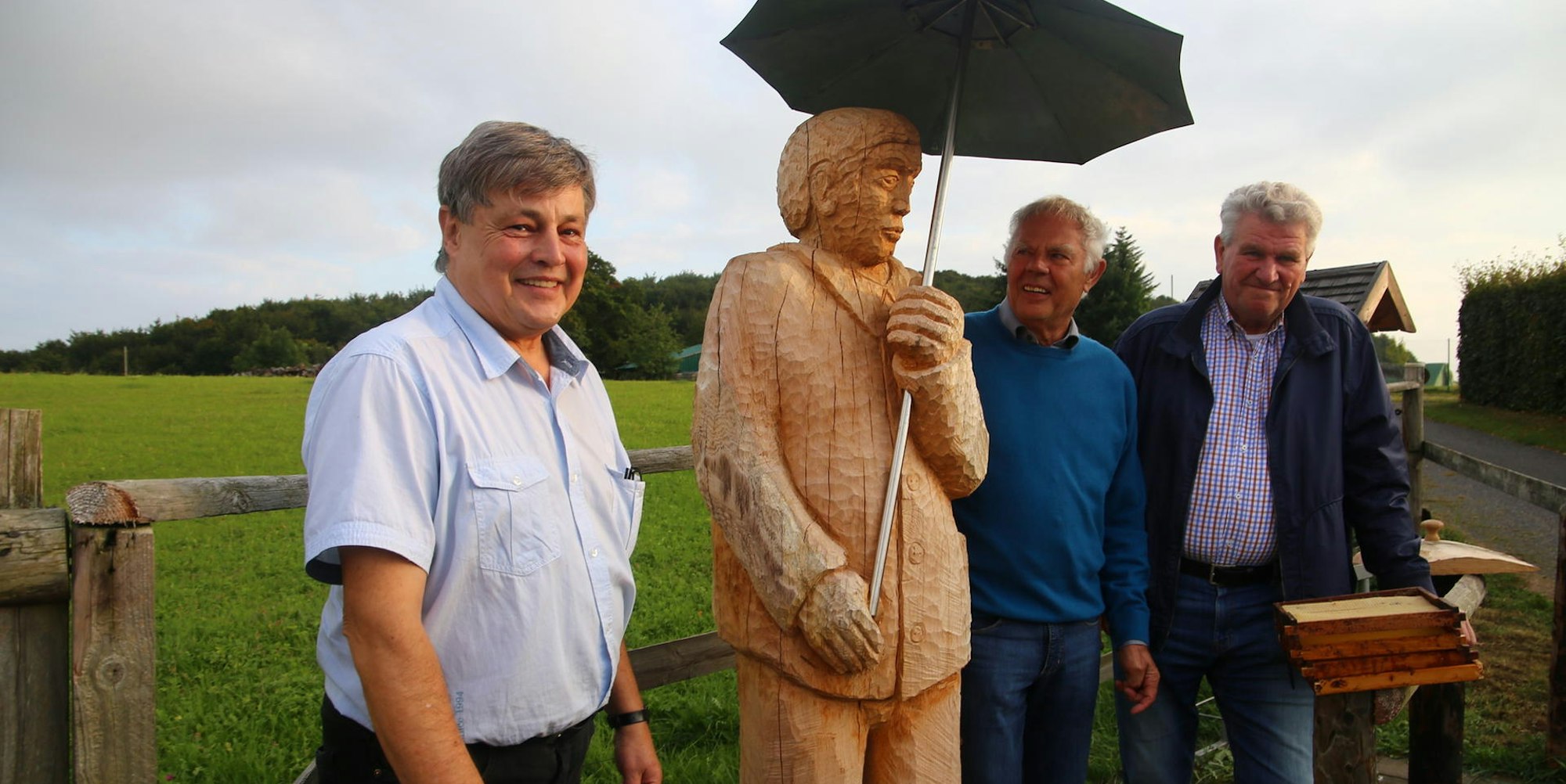 Nettersheim-Buir – Fast zwei Meter groß, steht er am Ortsrand von Buir an der „Feldscheid“: Durch einen metallenen Schirm ist der „Buirer Bienenmann“ vor den Unbilden des Eifelwetters geschützt. Am Freitagabend wurde er offiziell der Öffentlichkeit vorgestellt. Die honigfarbene Holzskulptur grüßt die Wanderer auf dem Weg von Holzmülheim nach Tondorf. Doch ihr Innenleben birgt Geheimnisse.