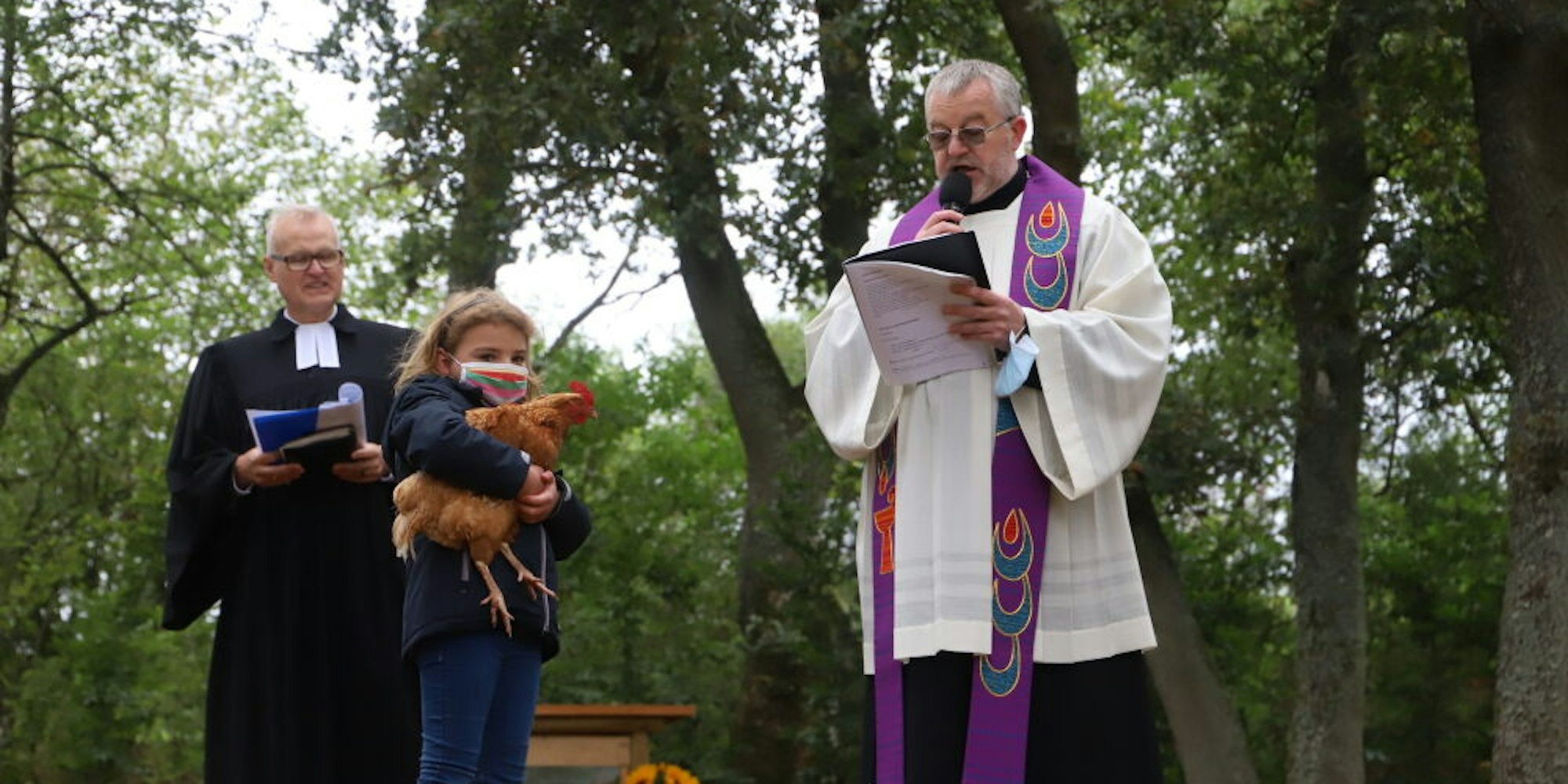 Auch das Huhn Biff, hier auf den Armen von Anna aus Engelgau, wollte bei der Segnung nicht hinten anstehen.
