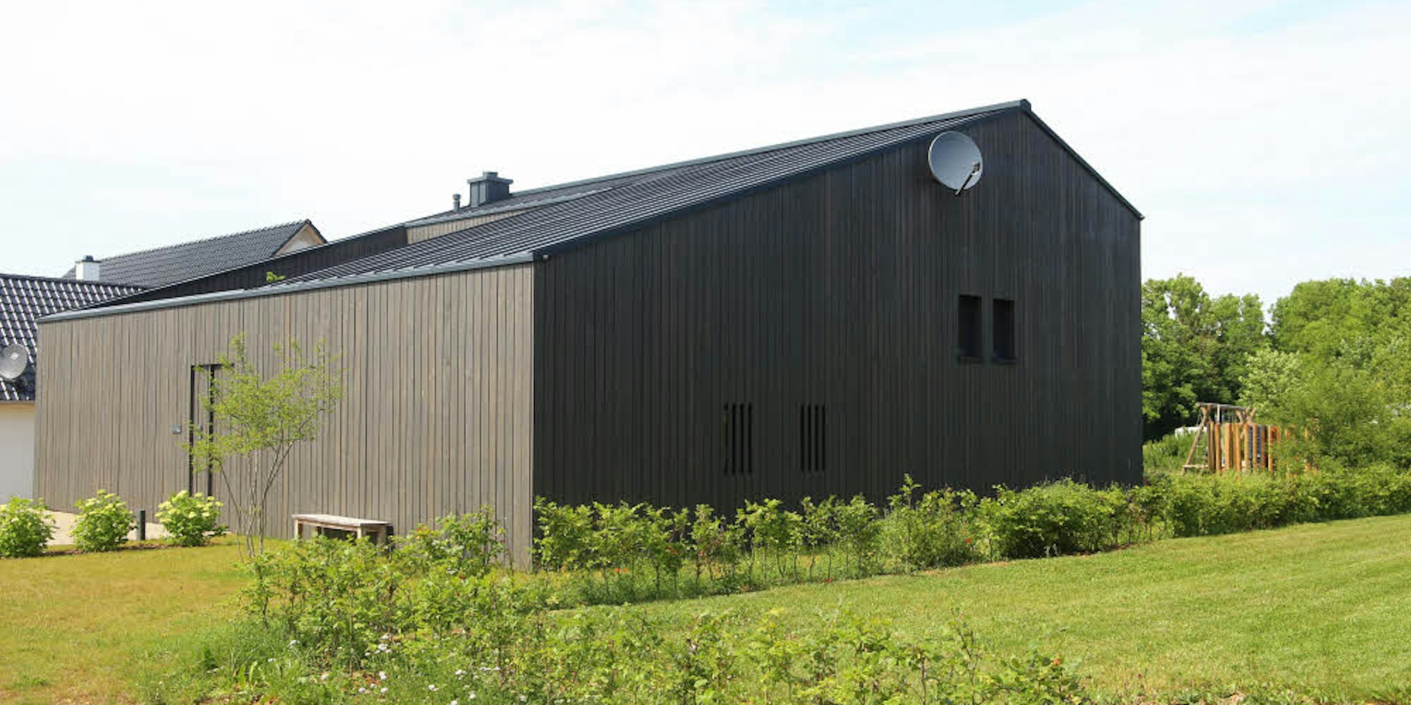 Mit dem Duktus einer Eifeler Feldscheune: Hinter der fensterlosen Front verbergen sich 130 Quadratmeter Wohnraum für die fünfköpfige Familie.