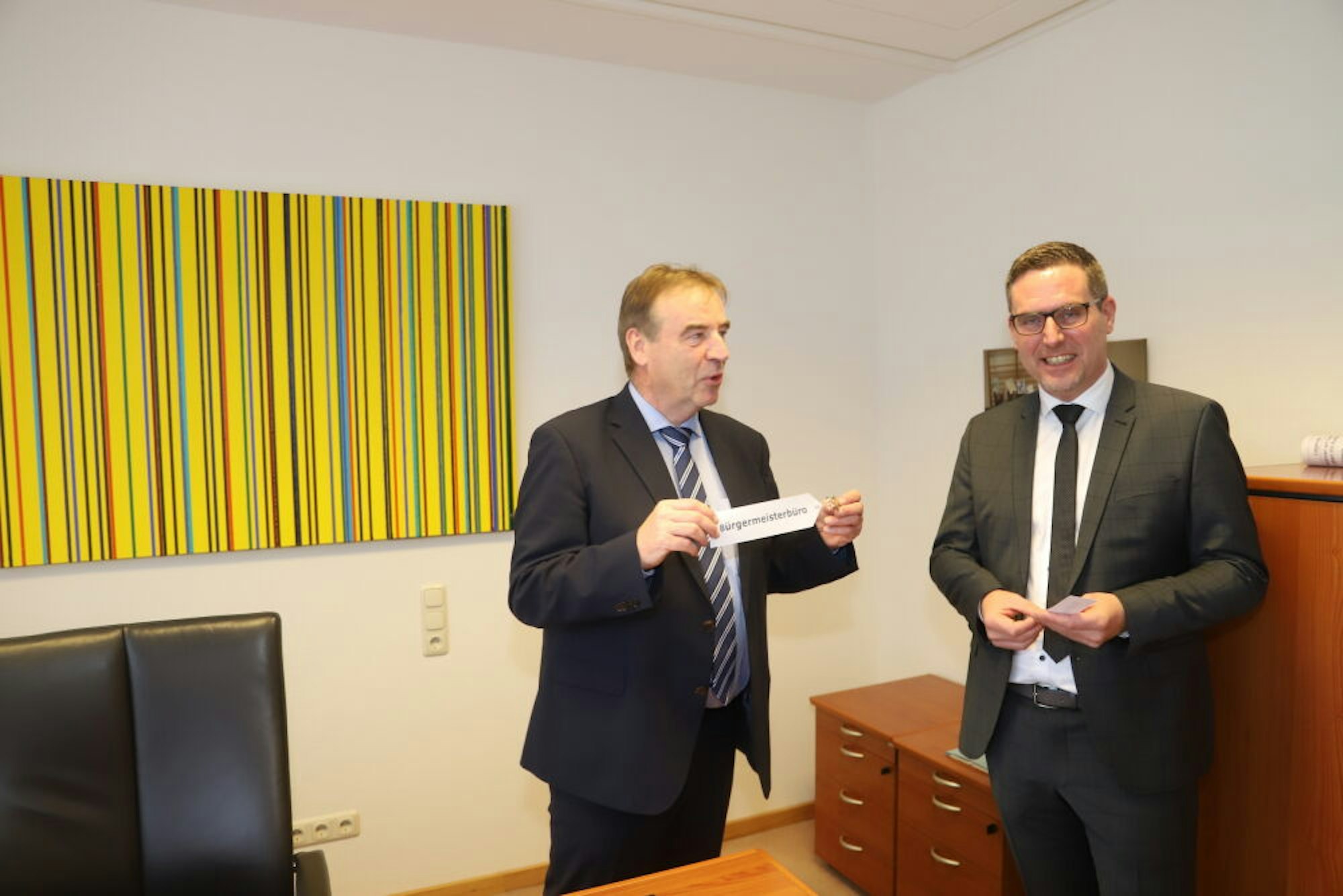 Schlüsselübergabe: Der neue Bürgermeister Norbert Crump (r.) mit dem scheidenden im Schaltzentrum der Macht.