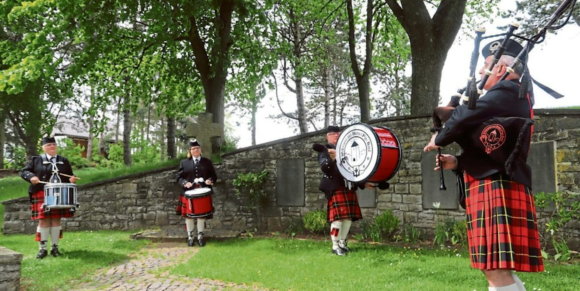 So staunten die Anwohner nicht schlecht, als am Nachmittag vier Mitglieder der Weilerswist and District Pipe Band sich an dem Denkmal versammelten und mit Dudelsack und Trommeln dem weltweiten Gedenken an das 75-jährige Jubiläum des Ende des Zweiten Weltkrieges ihren Beitrag hinzufügten. Allerdings in kleinem Kreise und ohne richtiges Publikum, denn immer noch gilt wegen der Ansteckungsgefahr ein Veranstaltungsverbot.