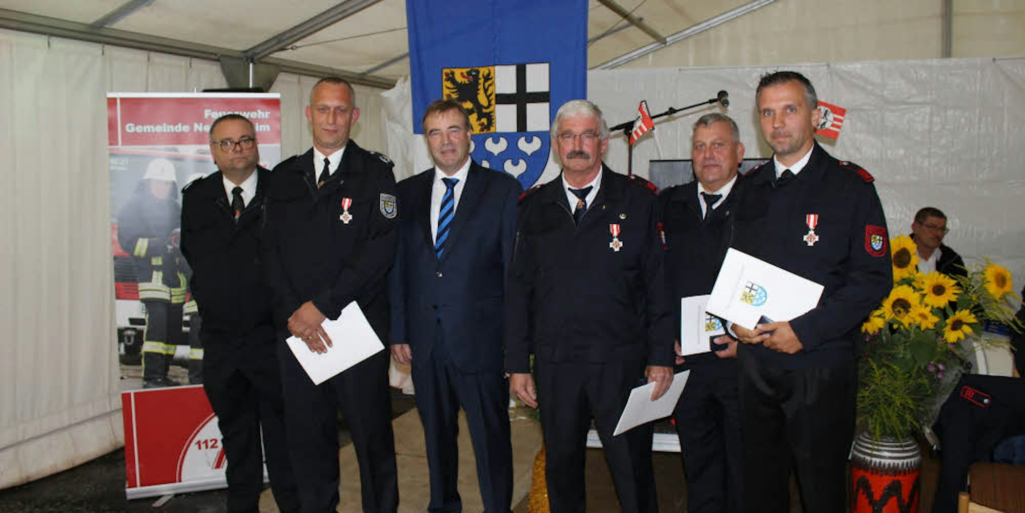 Verdiente Wehrleute wurden von Bürgermeister Wilfried Pracht (3.v.l.) für ihr Engagement geehrt.