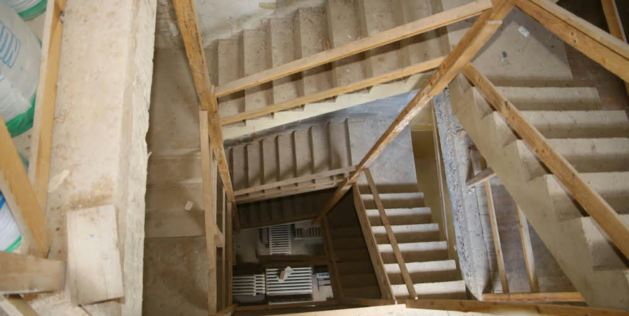 Eines von zwei neuen, weitläufigen Treppenhäusern, die an den Gebäudeenden neu gebaut werden.