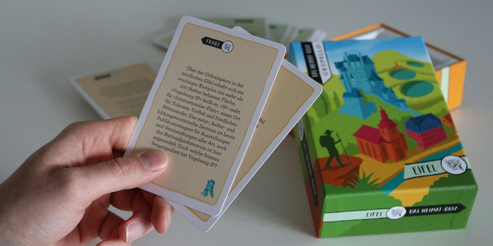 „Eifel. Das Heimat-Quiz“ – 100 Fragen und Antworten von Angelika Koch, ISBN 978-3-89978-408-4, vom Grupello-Verlag umfasst 103 Karten in einer Box und kostet 16,99 Euro.