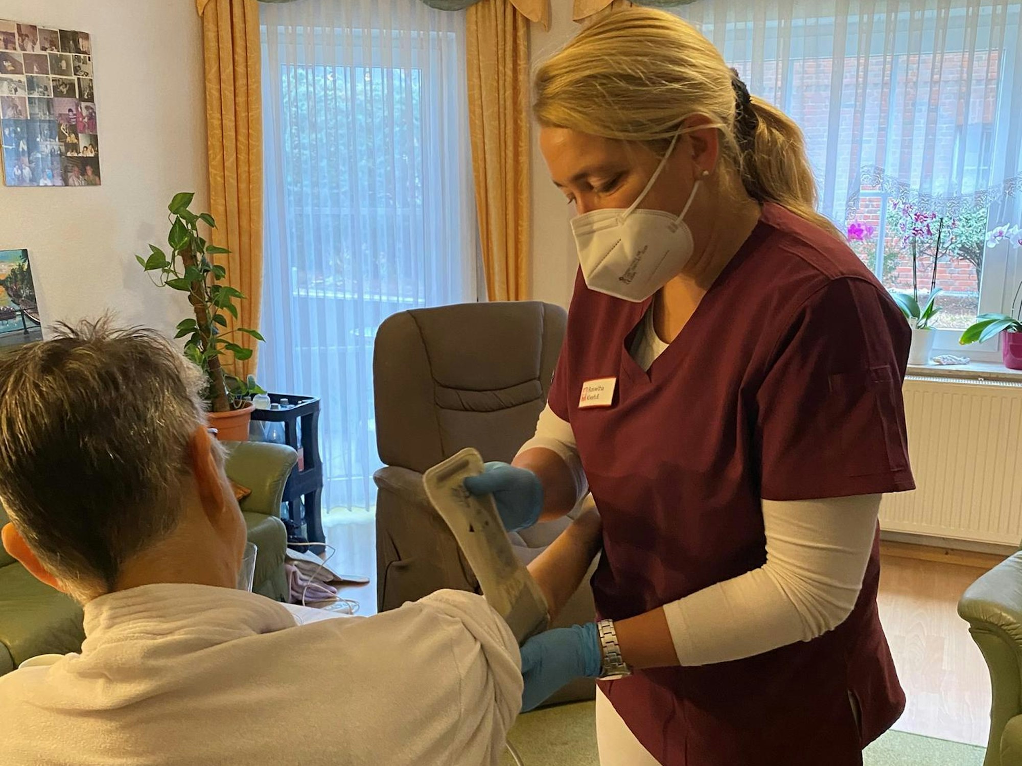 Roswitha Kleefuß bei einer Kundin, die durch die Chemotherapie derzeit sehr geschwächt ist.