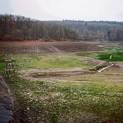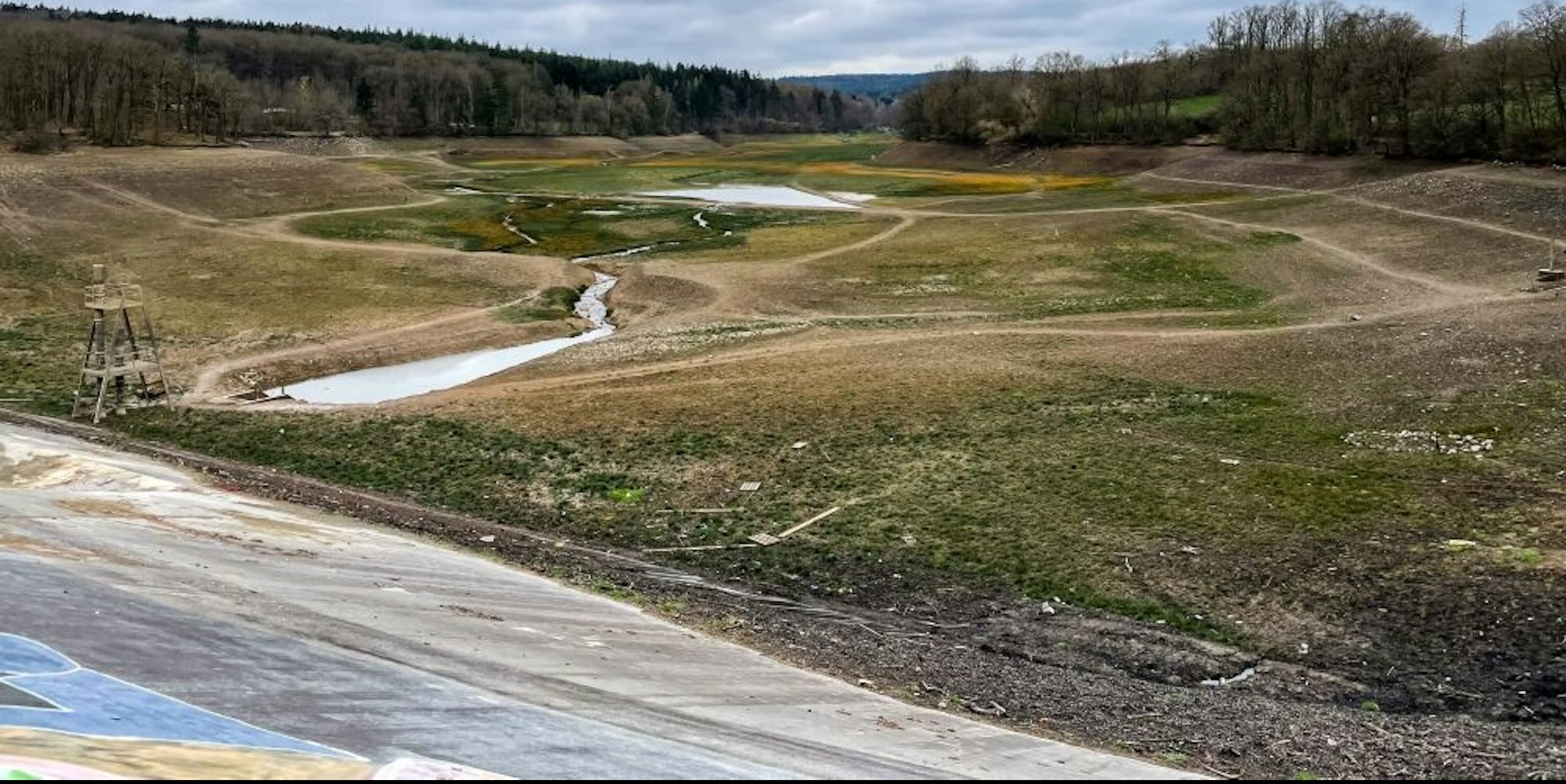 Der Steinbach schlängelt sich durch das leere Staubecken – eine fast unwirkliche Landschaft.