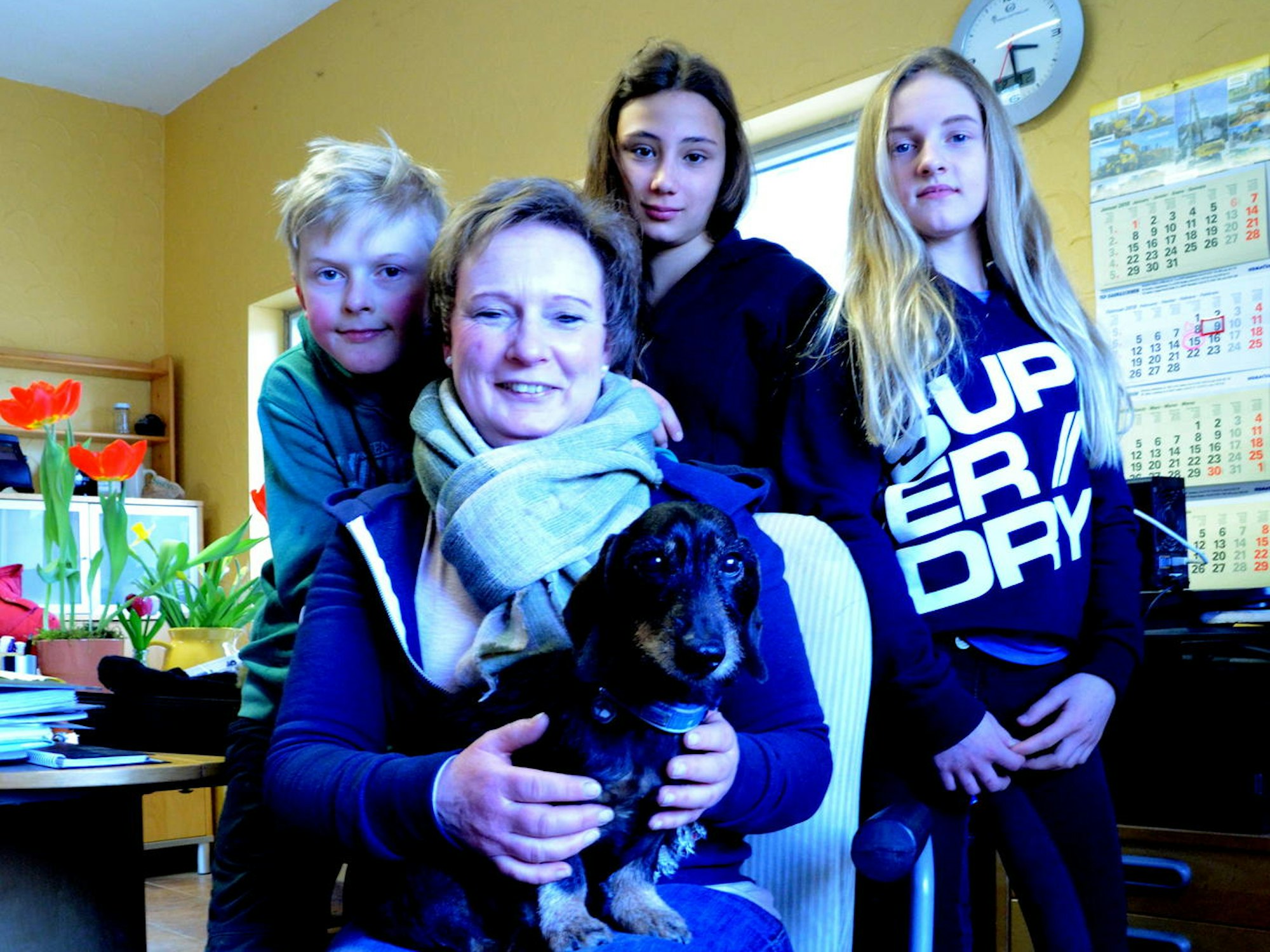 Sammy in seinem neuen Zuhause bei Constanze Ukerwitz und ihren Kindern Philipp und Friederike, in der Mitte freut sich Lea Hensen, Friederikes allerbeste Freundin, über das neue Familienmitglied.