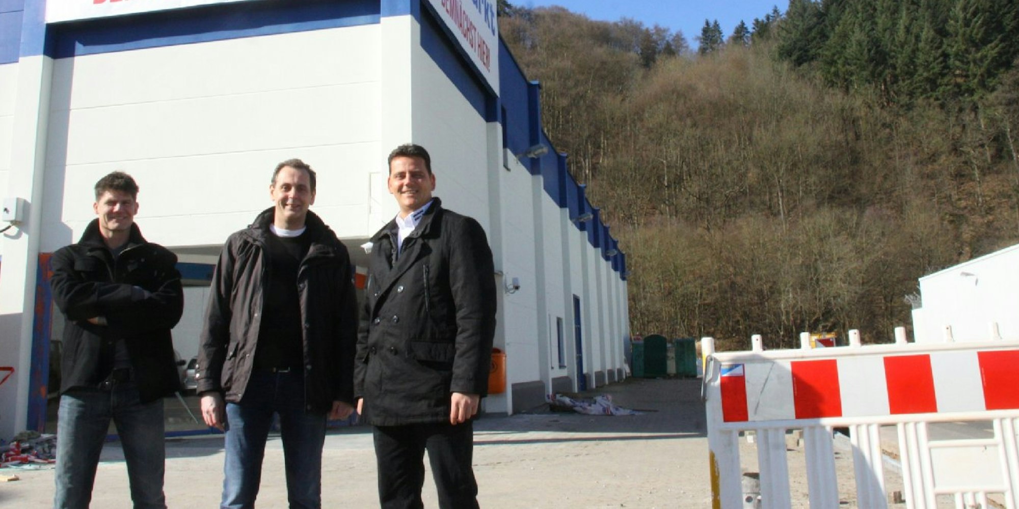 Mobau übernimmt den Praktiker-Baumarkt in Schleiden, Geschäftsführer sind Dominik Kratz und André Szurmant (v.l.), Marktleiter ist Jan Lehmann.