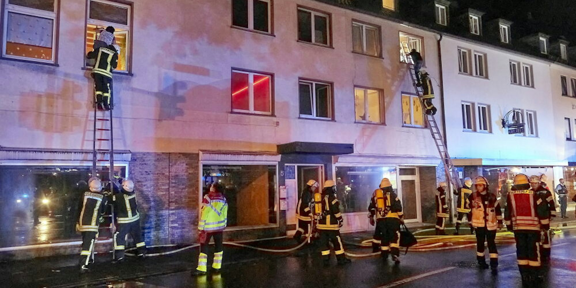 Über die Leitern brachten die Feuerwehrleute die Menschen ins Freie, da die Treppenhäuser verraucht waren.