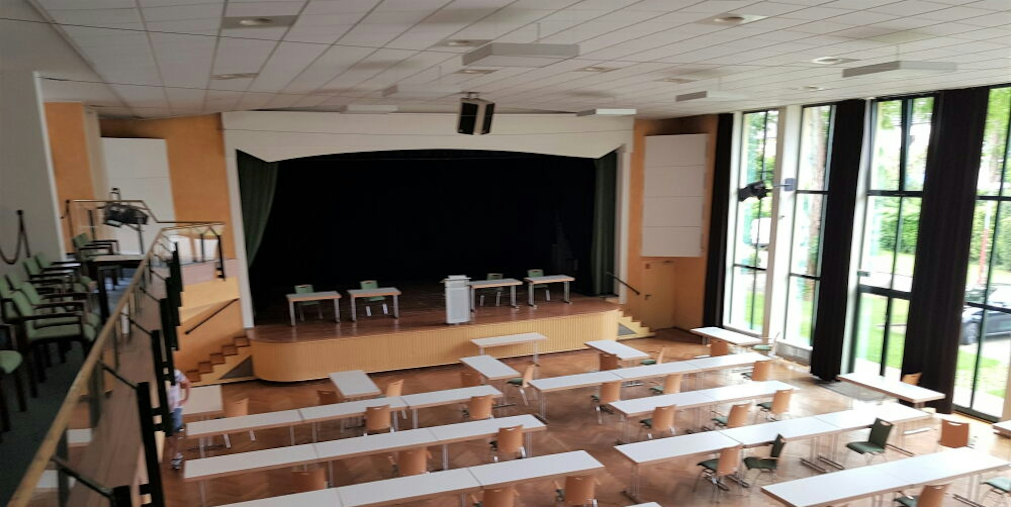 Die Elektroversorgung der Bühne sowie der Umkleide- und Sanitärräume und des Saales mit Empore sind mehr als 50 Jahre alt und dementsprechend ebenfalls sehr störanfällig. Daher ist ein normaler Veranstaltungsbetrieb kaum noch möglich. Die Bühne soll durch den Einbau eines Plattformliftes im Bereich des Nebeneingangs zu den Umkleide- und Sanitärräumen barrierefrei gestaltet werden. Außerdem fehlt eine Ausgabetheke für Getränke und Speisen.