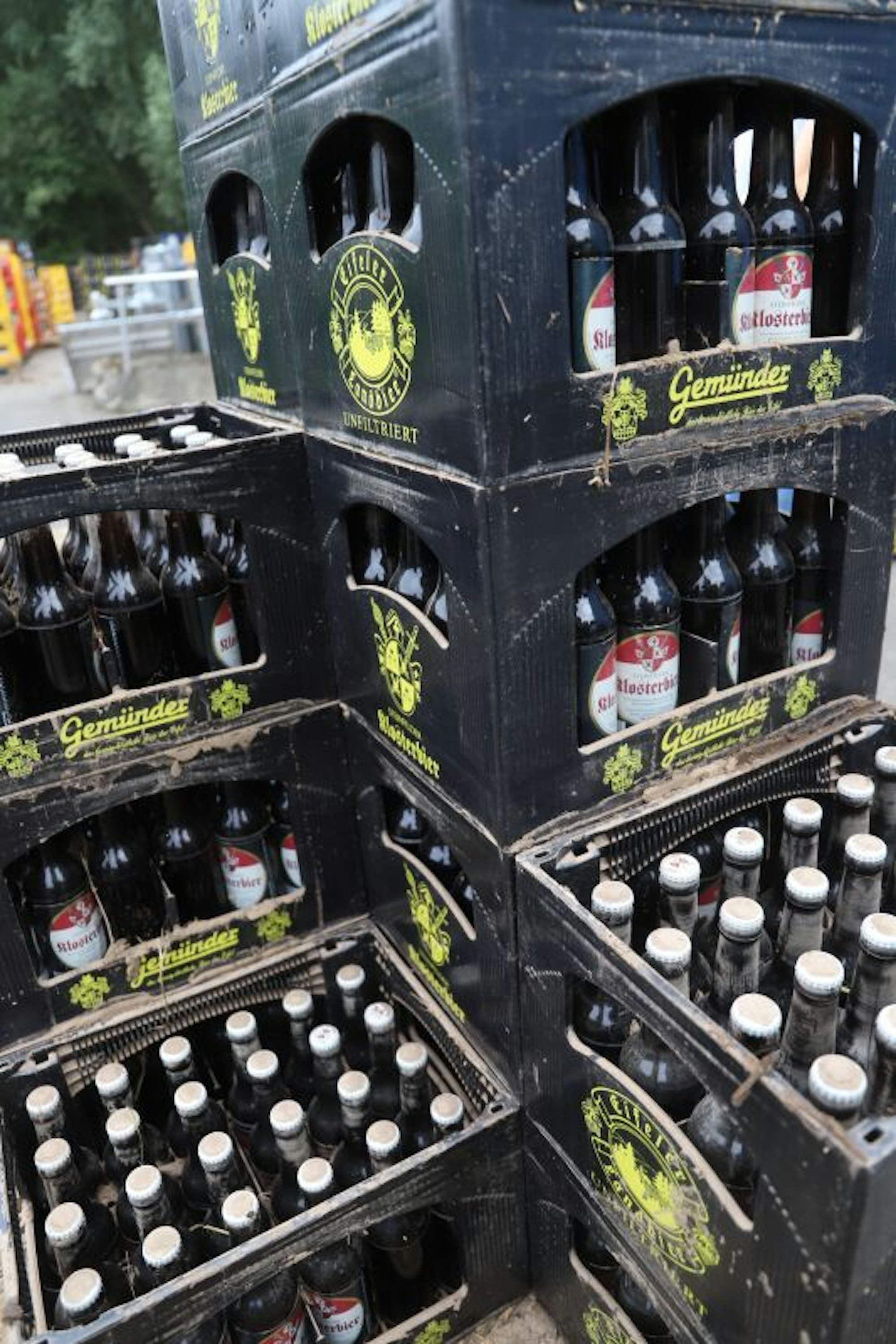 Die Bierkästen zeigen noch deutliche Spuren der Flut.