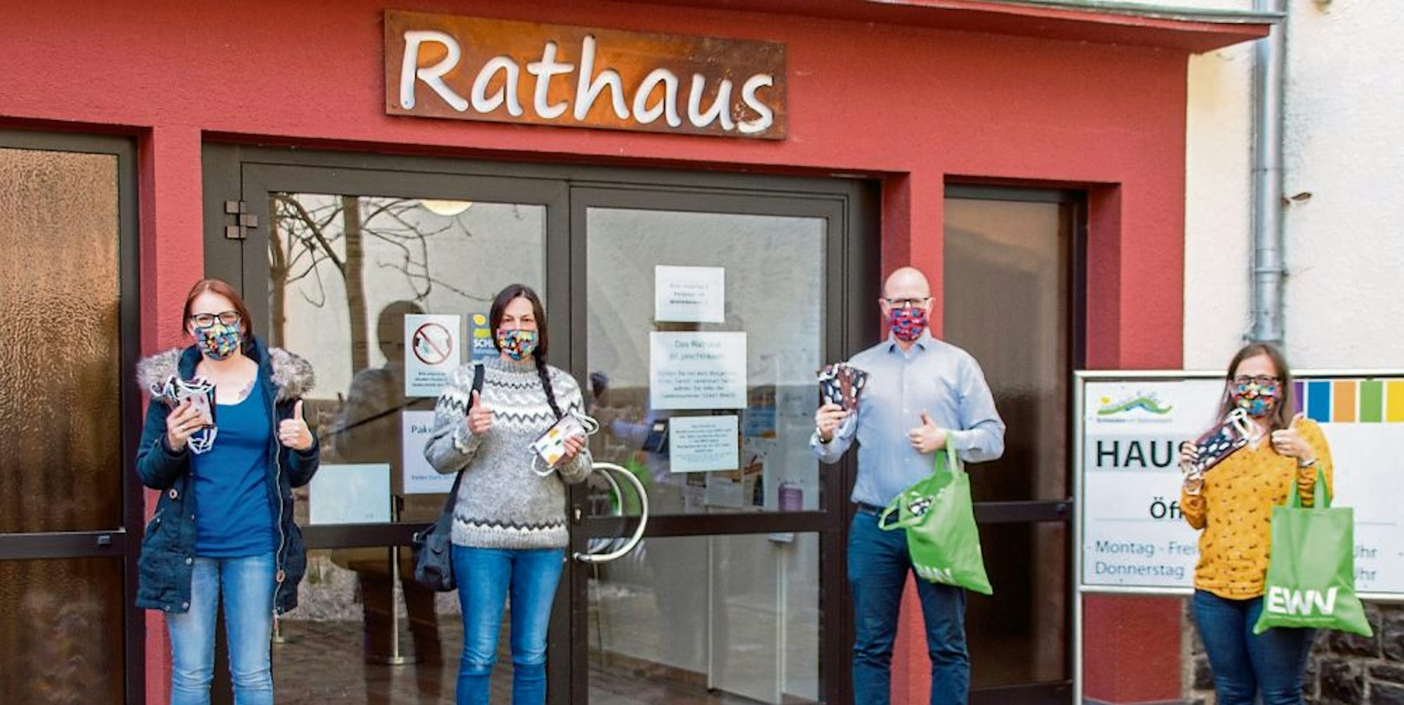 Für die Stadtverwaltung Schleiden nahm Bürgermeister Ingo Pfennings von Christina Bollig (v.l.), Angela Niessen und Nicole Müller 220 Mund- und Nasenbedeckungen entgegen.