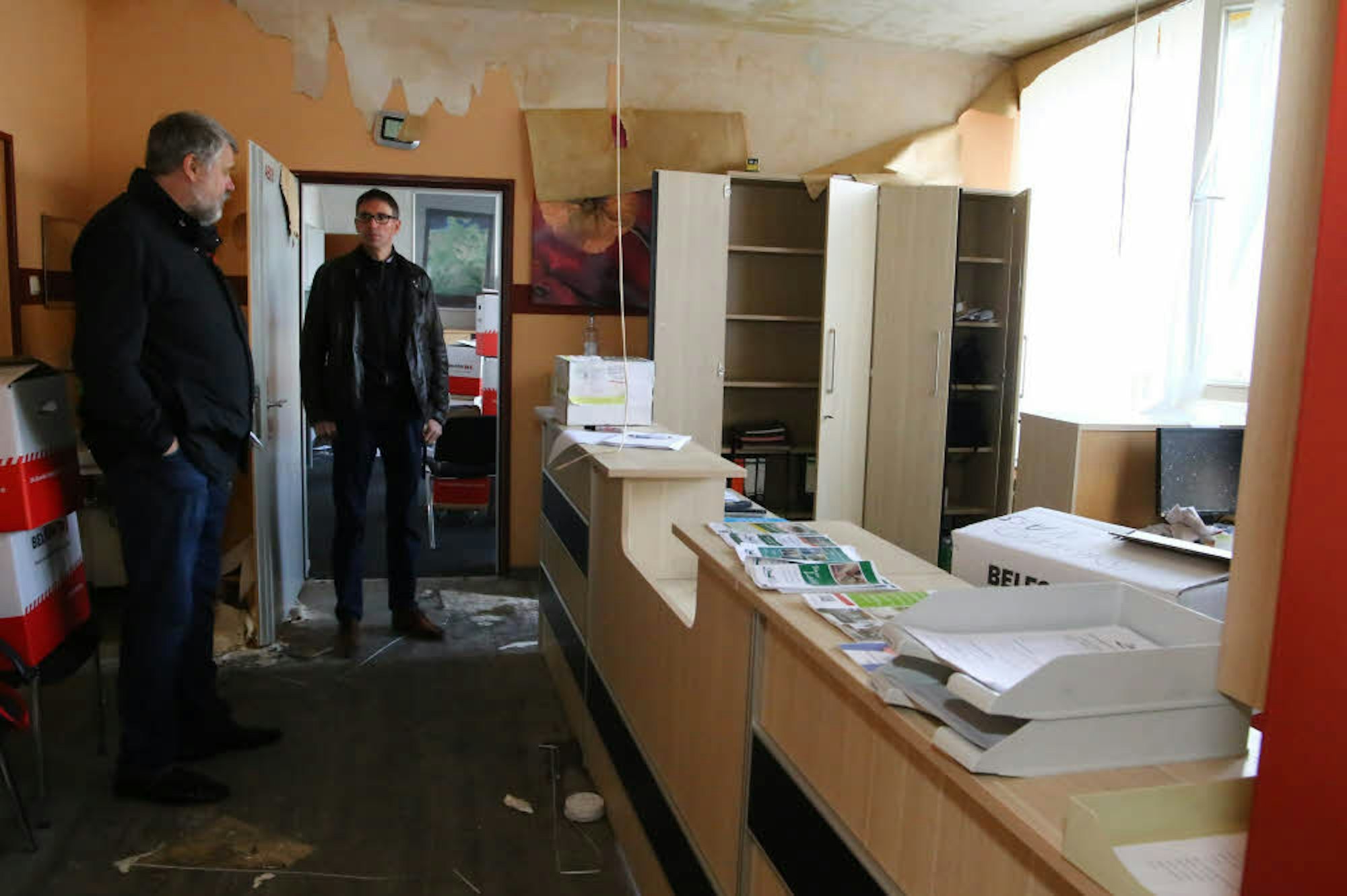 Das in Mitleidenschaft gezogene Sekretariat nahmen Schulleiter Georg Jöbkes (l.) und Beigeordneter Marcel Wolter in Augenschein.