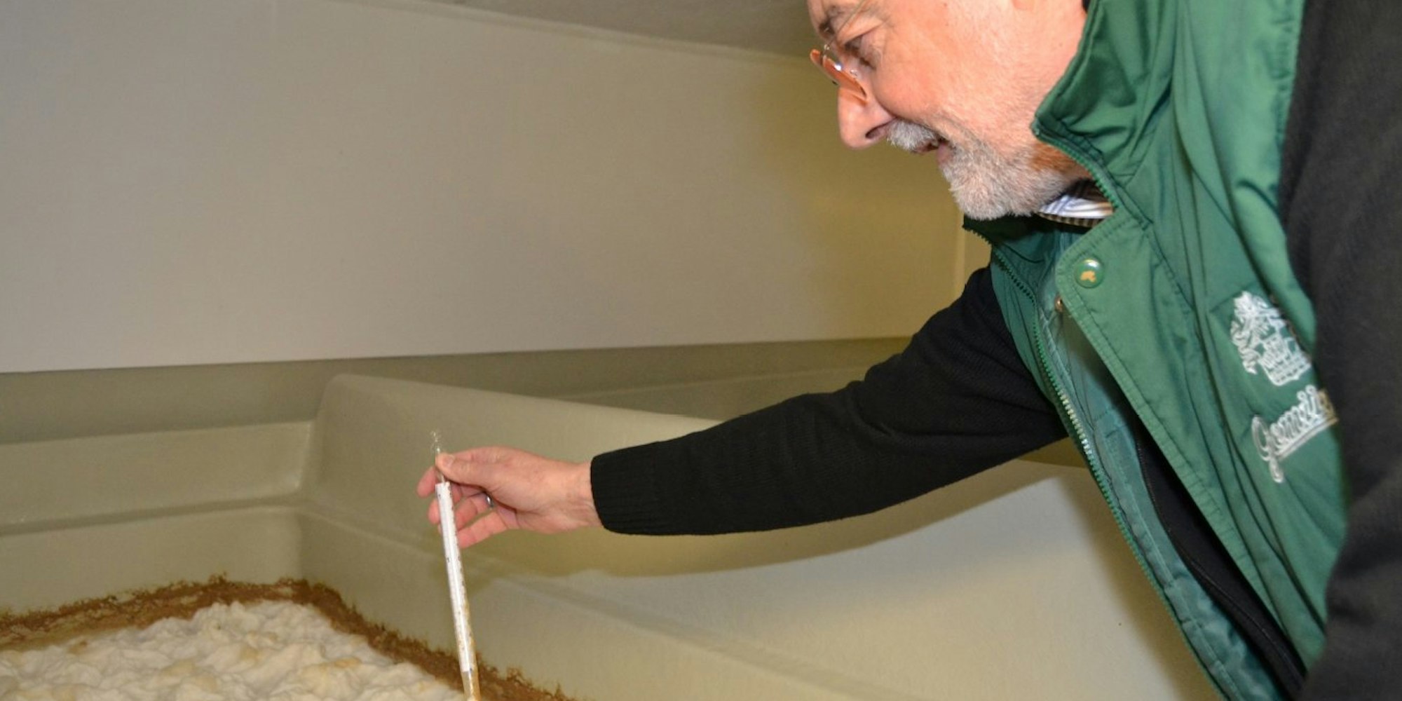 Geschäftsführer Werner Winkler testet die Temperatur der Maische.