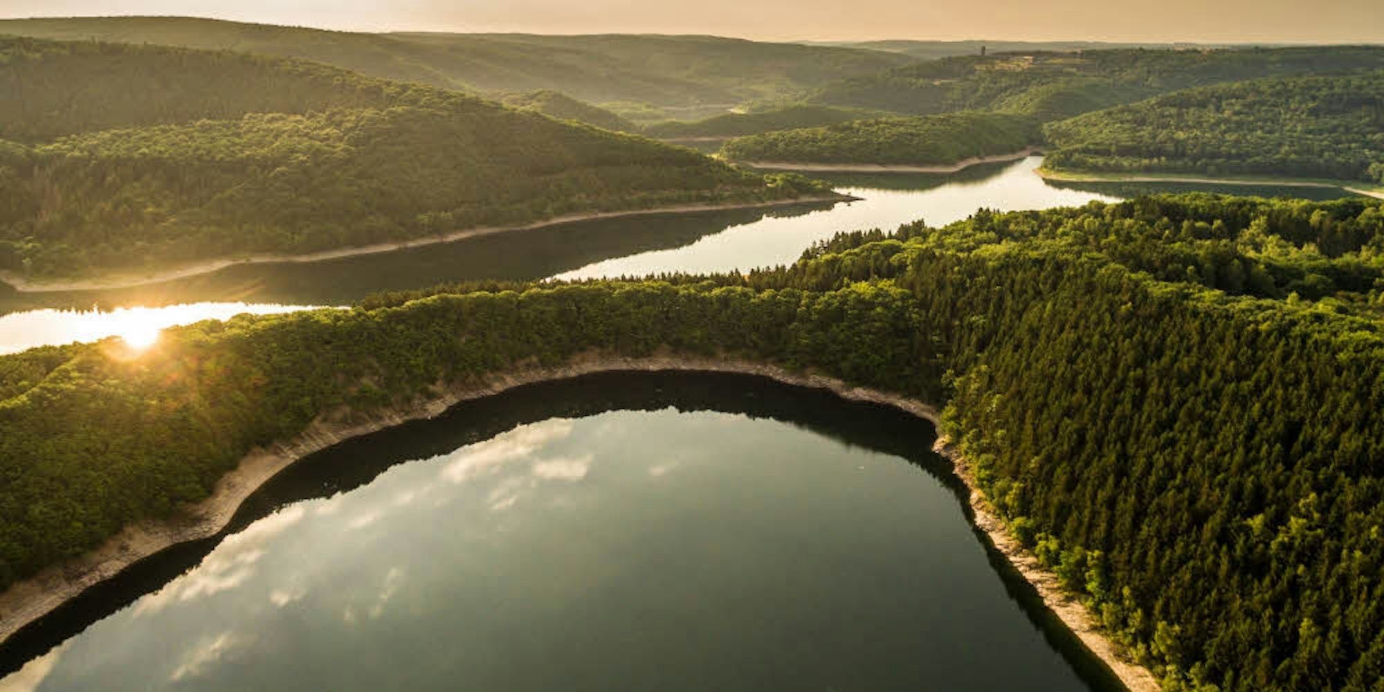 Blick auf den von Wäldern umgebenen Urftsee im Nationalpark Eifel.