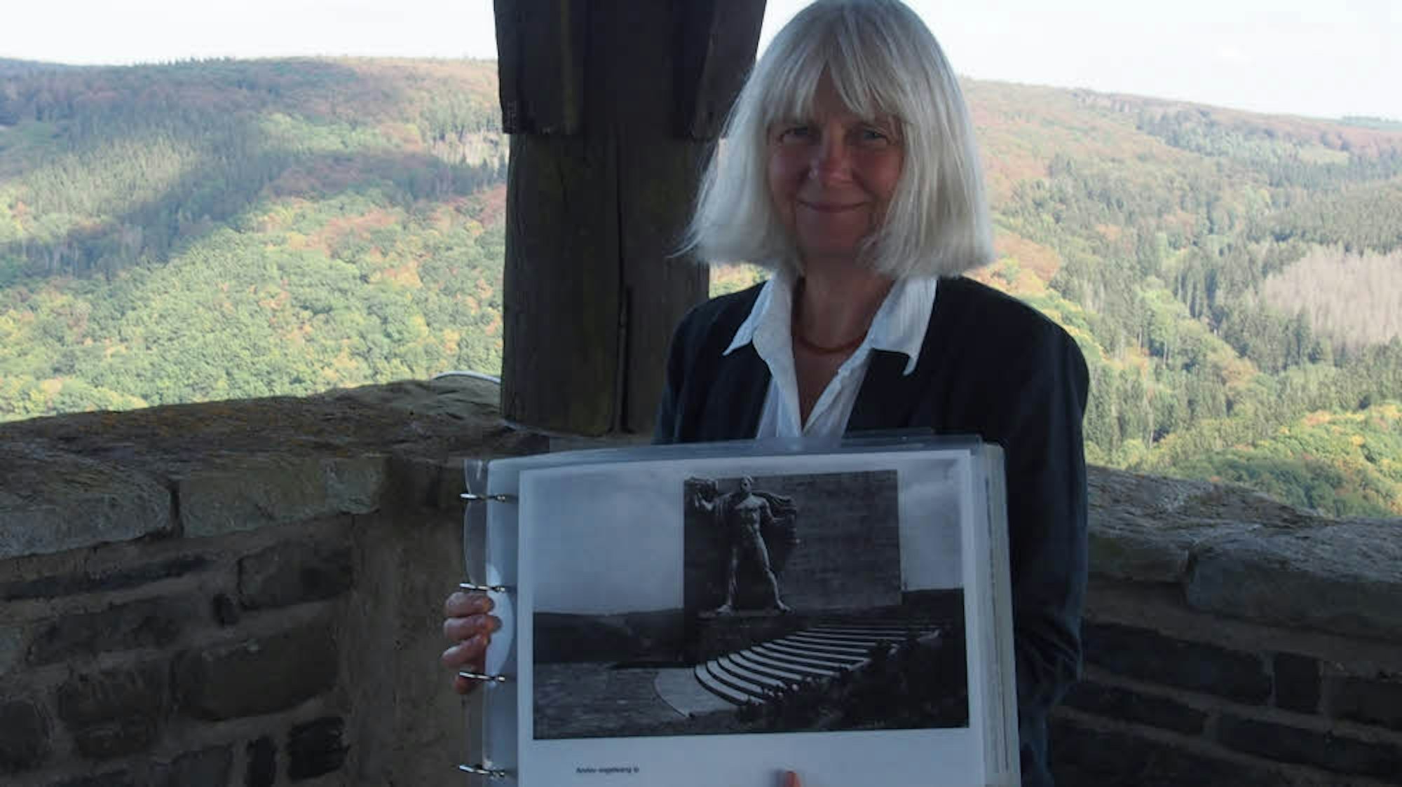 Gabriele Harzheim zeigt eine historische Aufnahme des „Fackelträger“-Reliefs – bis heute ein bei Rechten beliebtes Fotomotiv.