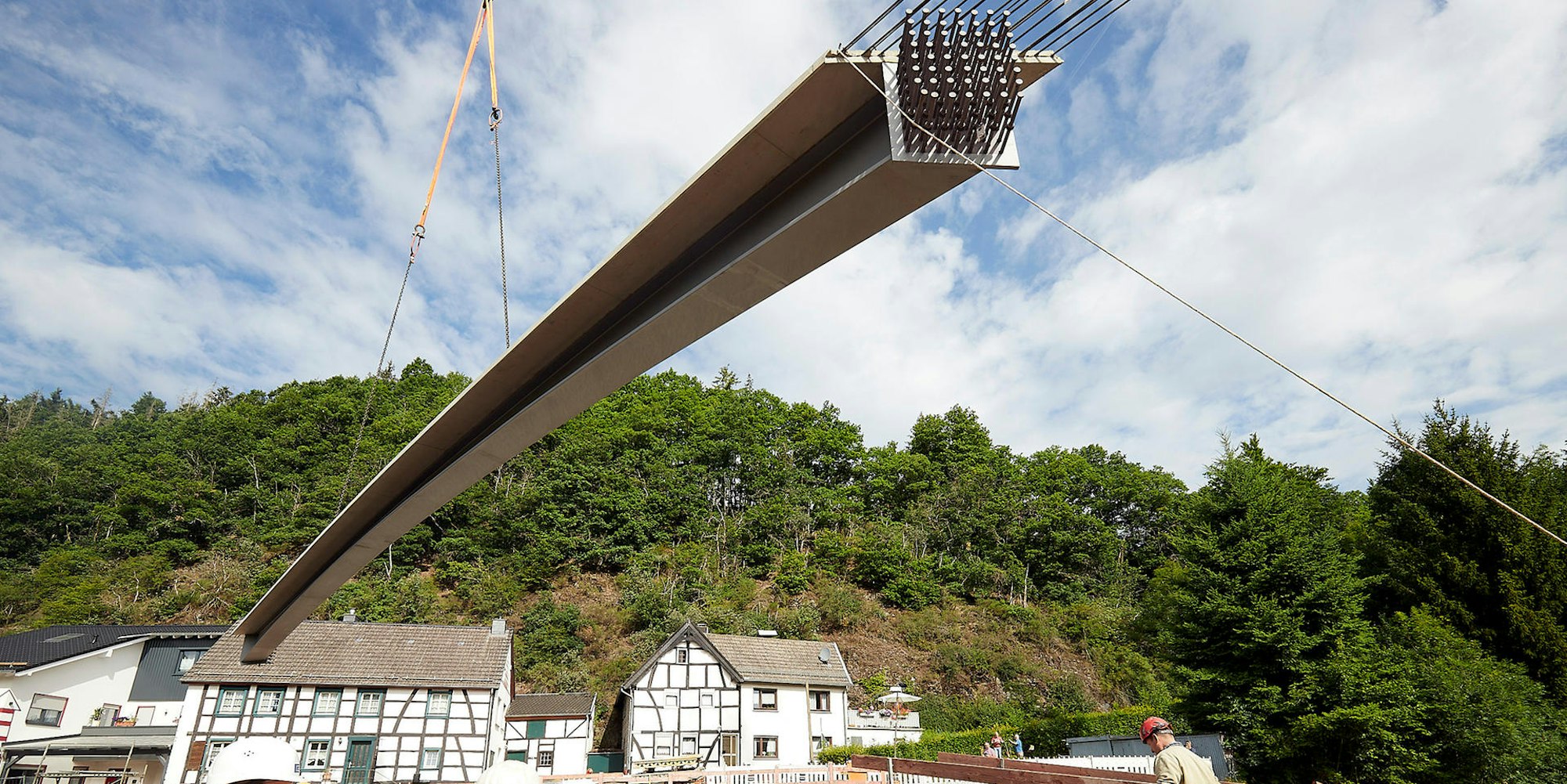 Wiederaufbau nach der FlutStahlträger für neue Brücke schweben über Oberhausen