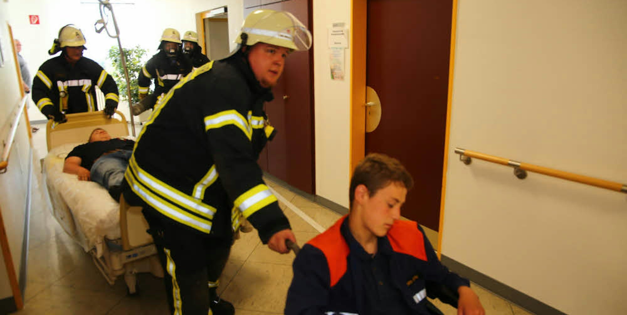 Fünf Verletzte sollten sich in einem verrauchten Raum befinden, so teilten die Pflegekräfte den Feuerwehrleuten mit, als sie oben im dritten Stock angekommen waren. Die Einsatzkräfte rollten die Schläuche aus den Wandhydranten aus und gingen auf Personensuche. Dabei waren sie so schnell, dass sie damit das eigentlich geplante Szenario durcheinanderbrachten.