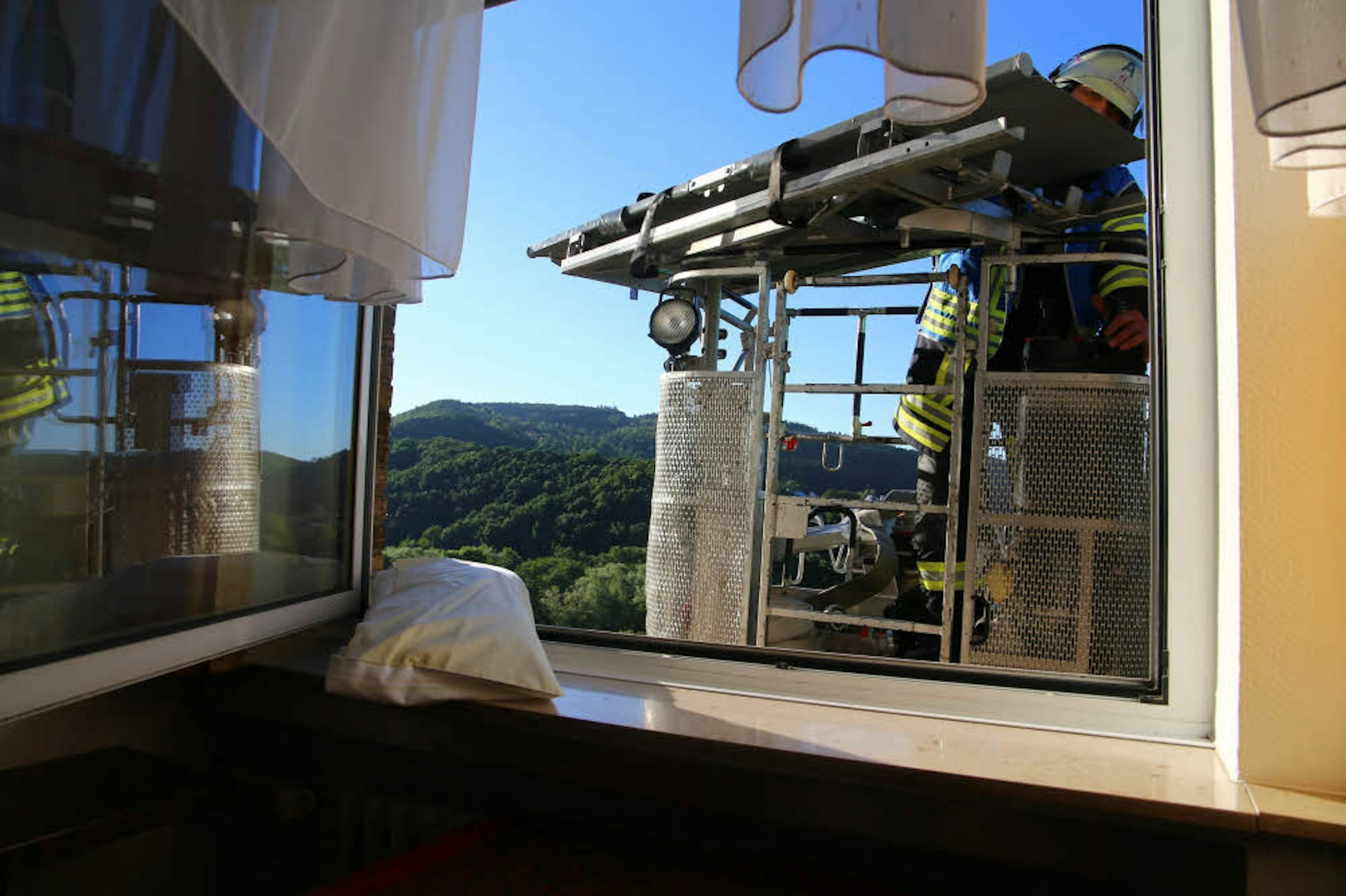 Als zweiten Rettungsweg nutzten die Feuerwehrleute die Fenster der Krankenzimmer von der Drehleiter aus.