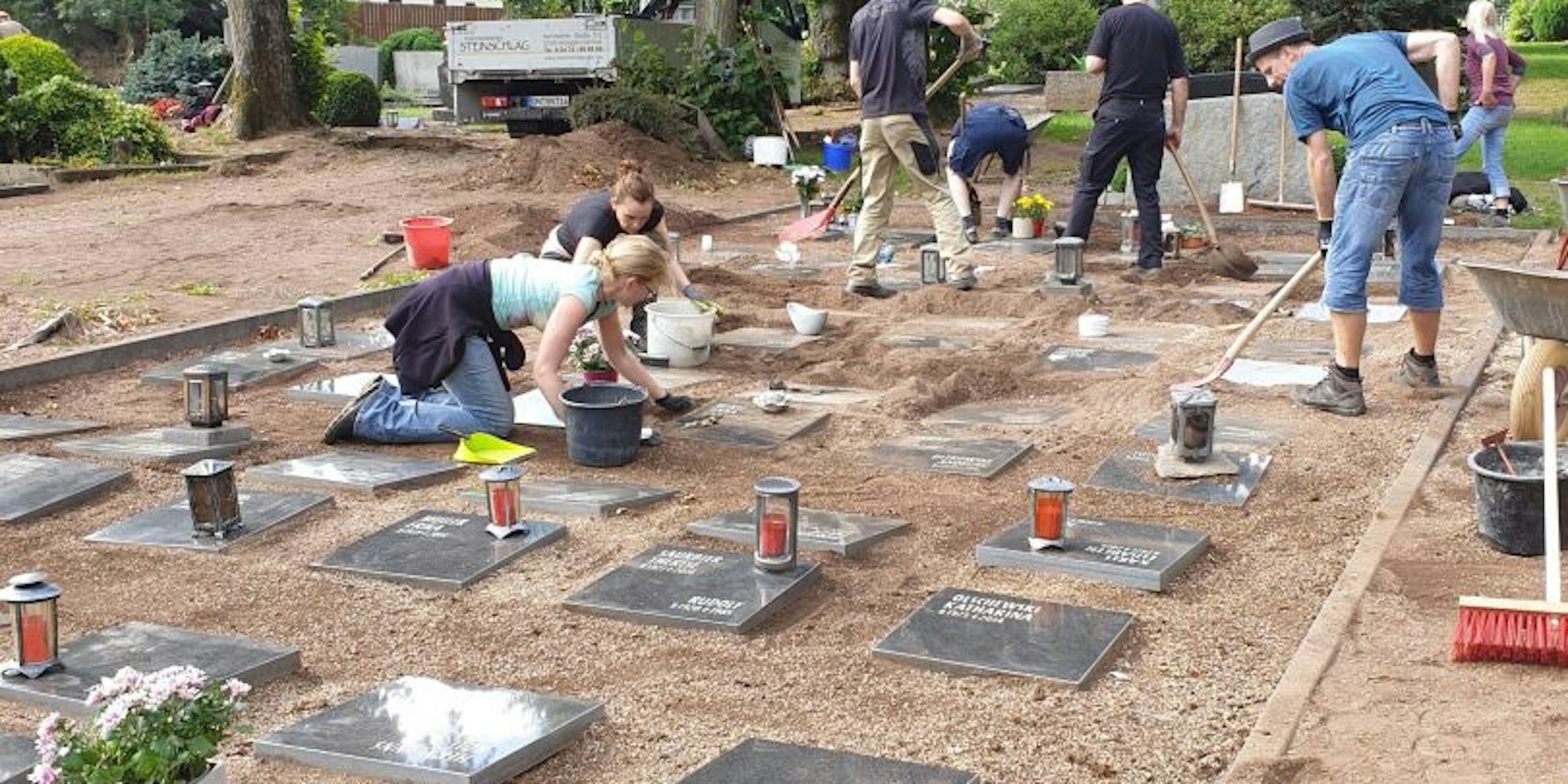 Mit Schaufeln und Besen im Gepäck, aber auch mit Lkw und großen Geräten kamen sie Anfang August zu einer ersten Aktion zum Friedhof. Gemäß einer Mitteilung der Stadt waren neben Angehörigen von Verstorbenen auch Forstwirte, Sachverständige, Bestatter, Krankenschwestern, Garten- und Landschaftsbauer, Friedhofsgärtner, Steinmetze, Bauunternehmer und Gärtner mit von der Partie, um den Friedhof wieder in einen würdigen Ort der Trauer und Begegnung zu verwandeln.