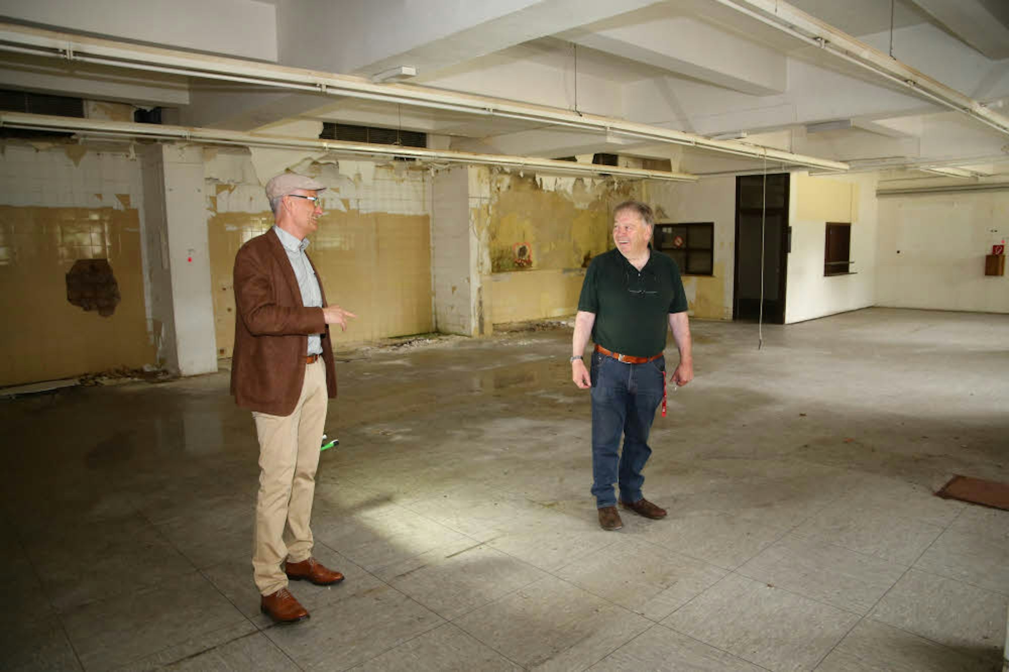Im ehemaligen Lebensmittelmarkt der Belgier begutachteten Martin Degener (r.) und Thomas Fischer-Reinbach das Untergeschoss des Fahrzeughofes.