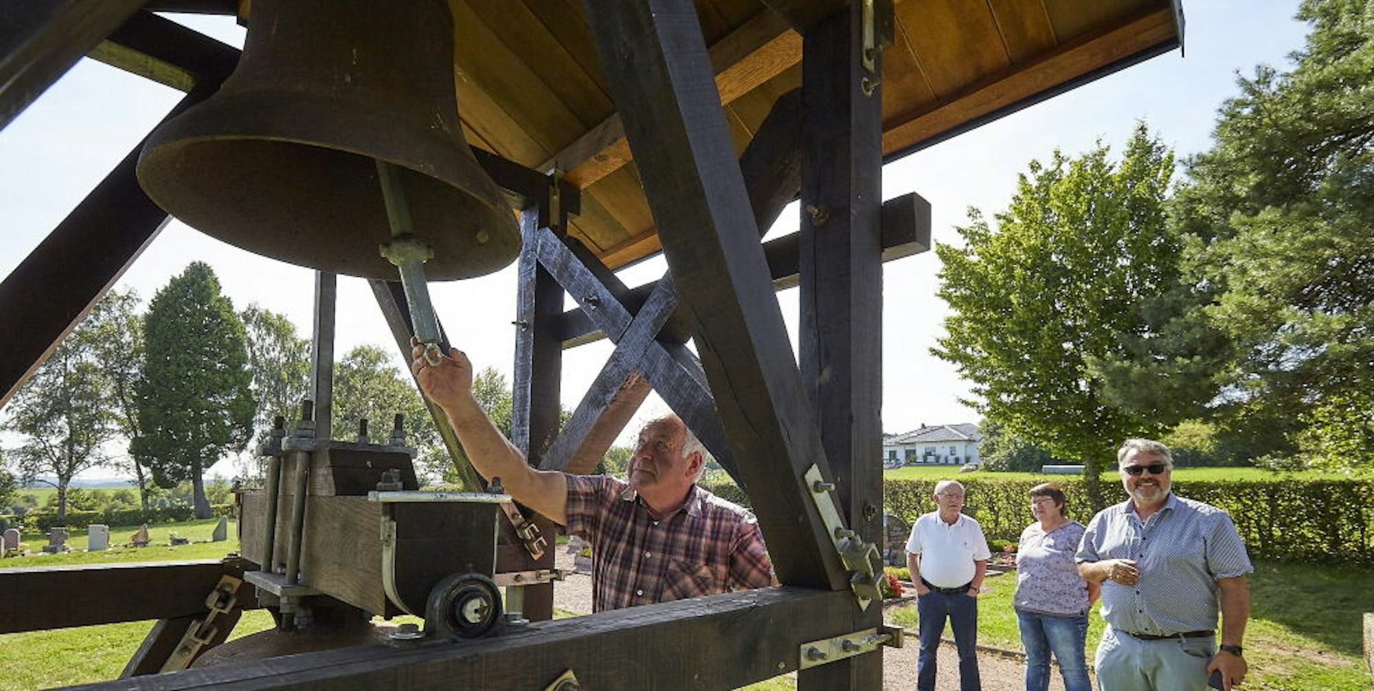 Klangprobe der besonderen Art: Dieter Hörnchen schlägt die Glocke auf dem Harperscheider Friedhof an.