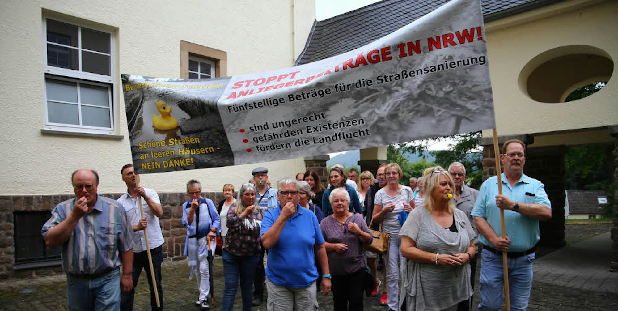 Bereits Anfang Juli 2018 war vor dem Schleidener Rathaus demonstriert worden. Die Initiative hatte, nachdem zuvor ein Antrag der SPD zur Senkung der Beiträge gescheitert war, einen Einwohnerantrag mit gleichem Tenor gestellt. Knapp 40 Mitglieder der Initiative empfingen die Politiker des Stadtrats mit Transparenten und Trillerpfeifen, um ihr Anliegen durchzusetzen. Vergeblich: Gegen sechs SPD-Stimmen und bei einer Enthaltung von Helmut Peters (CDU) scheiterte der Antrag.