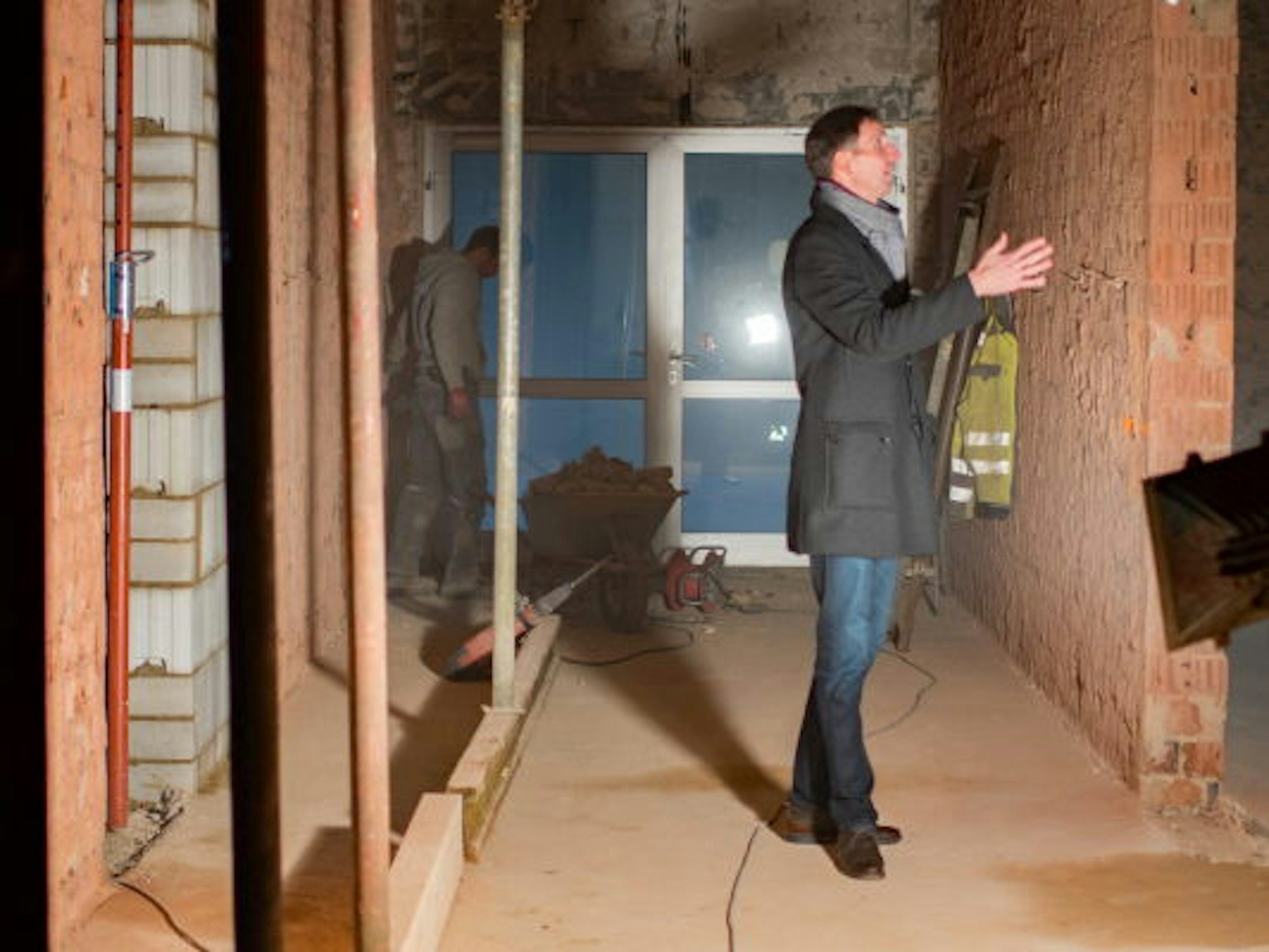 Ab Oktober sind zunächst Zimmererarbeiten erledigt worden, bis in den November Arbeiten am Dach, an der Blitzschutzanlage sowie Gerüstarbeiten. Im Dezember haben – wie es der Zeitplan vorsieht – die Arbeiter im Inneren der Schule Maurer- und Rohbauarbeiten vorgenommen. Neben dem reinen Wiederaufbau sind auch deutliche Verbesserungen vorgesehen. Die Räume sollen ein zeitgemäßes Erscheinungsbild erhalten. „Hier werden statt einzelner Klassen offene Lernbereiche eingerichtet“, erklärt Marcel Wolter, Beigeordneter der Stadt Schleiden, bei einem Rundgang durch den ersten Stock des A-Traktes: „Es war uns wichtig, dass nicht nur renoviert, sondern auch modernisiert wird.“